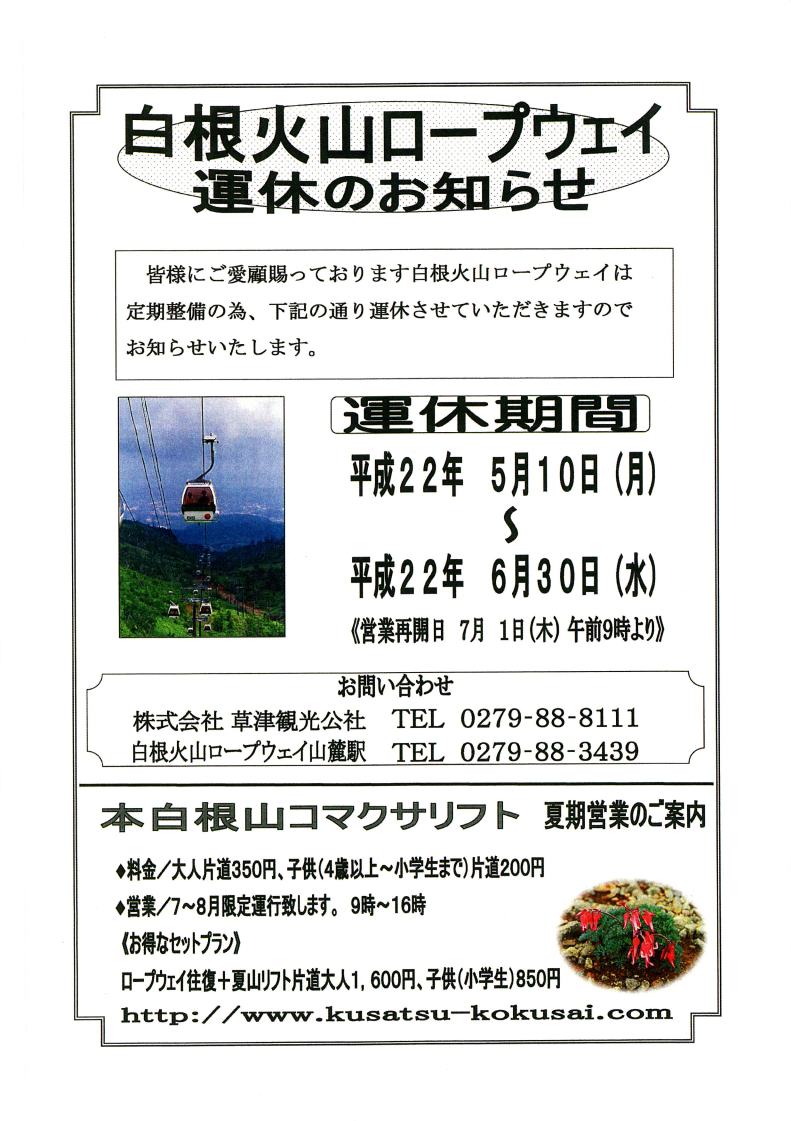白根火山ロープウェイ運休のお知らせ By 草津スカイランドホテルIn お知らせPosted 2010年4月14日0 Comment(s) 白根火山ロープウェイは定期点検の為、下記の期間運休となります。 運休期間 平成22年5月10日(月)~6月30日(水) 約2ヶ月の間、お休みとなります。白根山へお出かけをご予定の方、ご承知くださいます様、お願い申し上げます。 7月、8月 本白根コマクサリフトが営業されます。コマクサを鑑賞しに行く際、是非ご利用ください。 ポチッと、押して応援をお願いすますm(_ _)m ↓↓↓ ↓↓↓ 草津スカイランドホテル・栖風亭(せいふうてい)