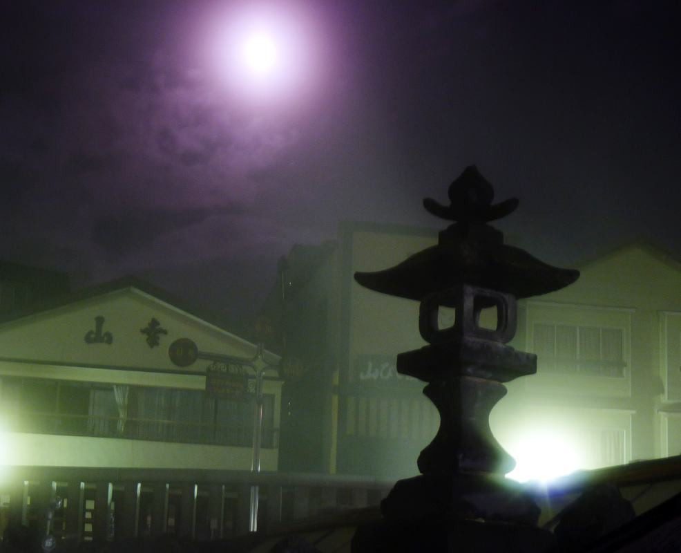 湯畑の湯滝の灯篭と満月♪