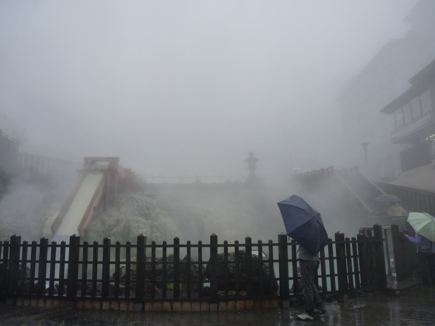 霧が濃く、湯畑での湯けむりもたくさん立ち込めております。