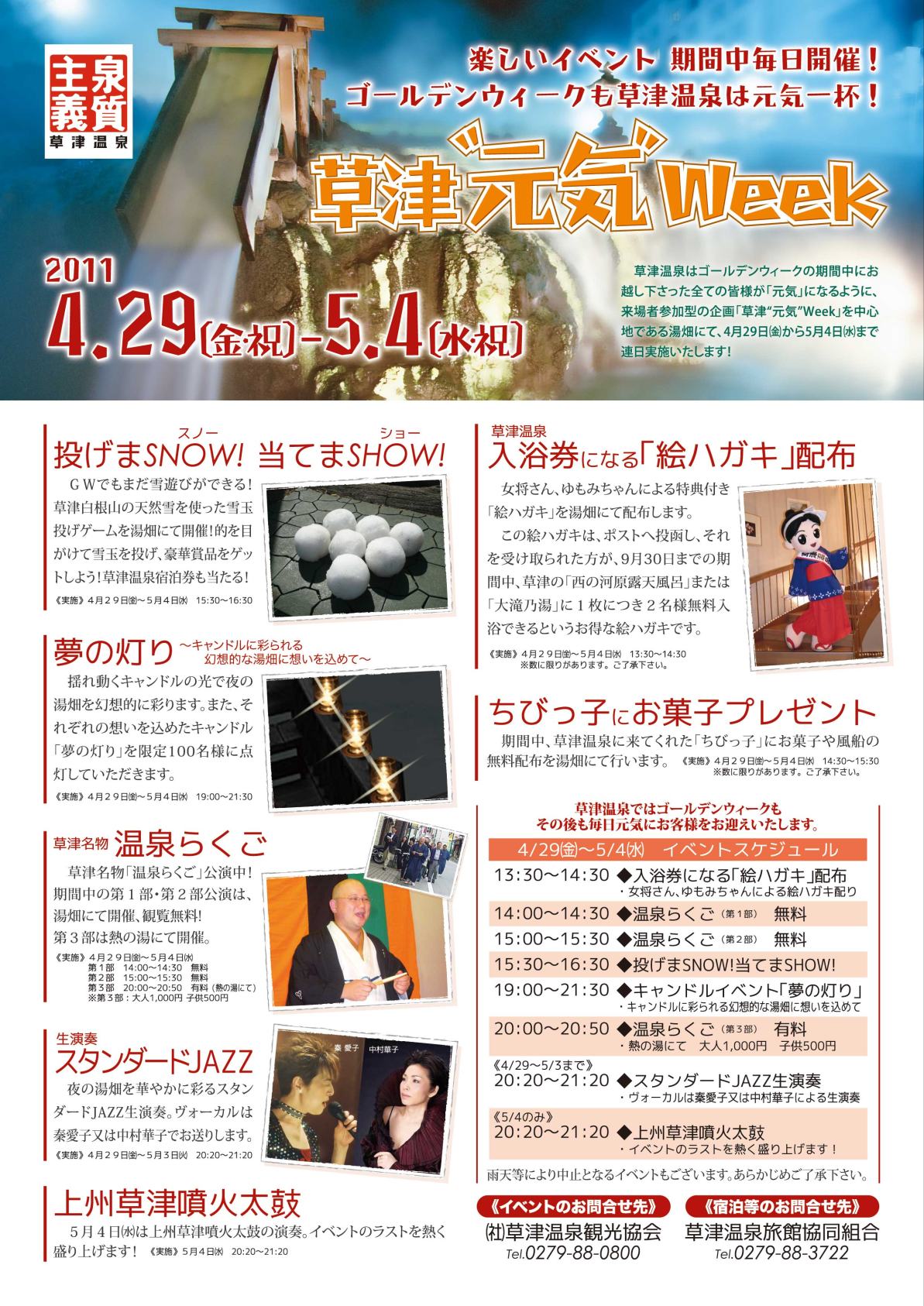 草津“元気”WEEK いよいよ明日から開催! By 草津スカイランドホテルIn イベント情報Posted 2011年4月28日0 Comment(s) 草津“元気”WEEKは、いよいよ明日から開催されます。とても立派なチラシも出来ました。 是非、どしどし湯畑にお集まり頂き、湯畑を賑やかにしましょう! 草津温泉は、元気一杯です。いらしたお客様に、元気を差し上げま~す♪ ポチッと、押して応援をお願いすますm(_ _)m ↓↓↓ ↓↓↓ 草津スカイランドホテル・栖風亭(せいふうてい)