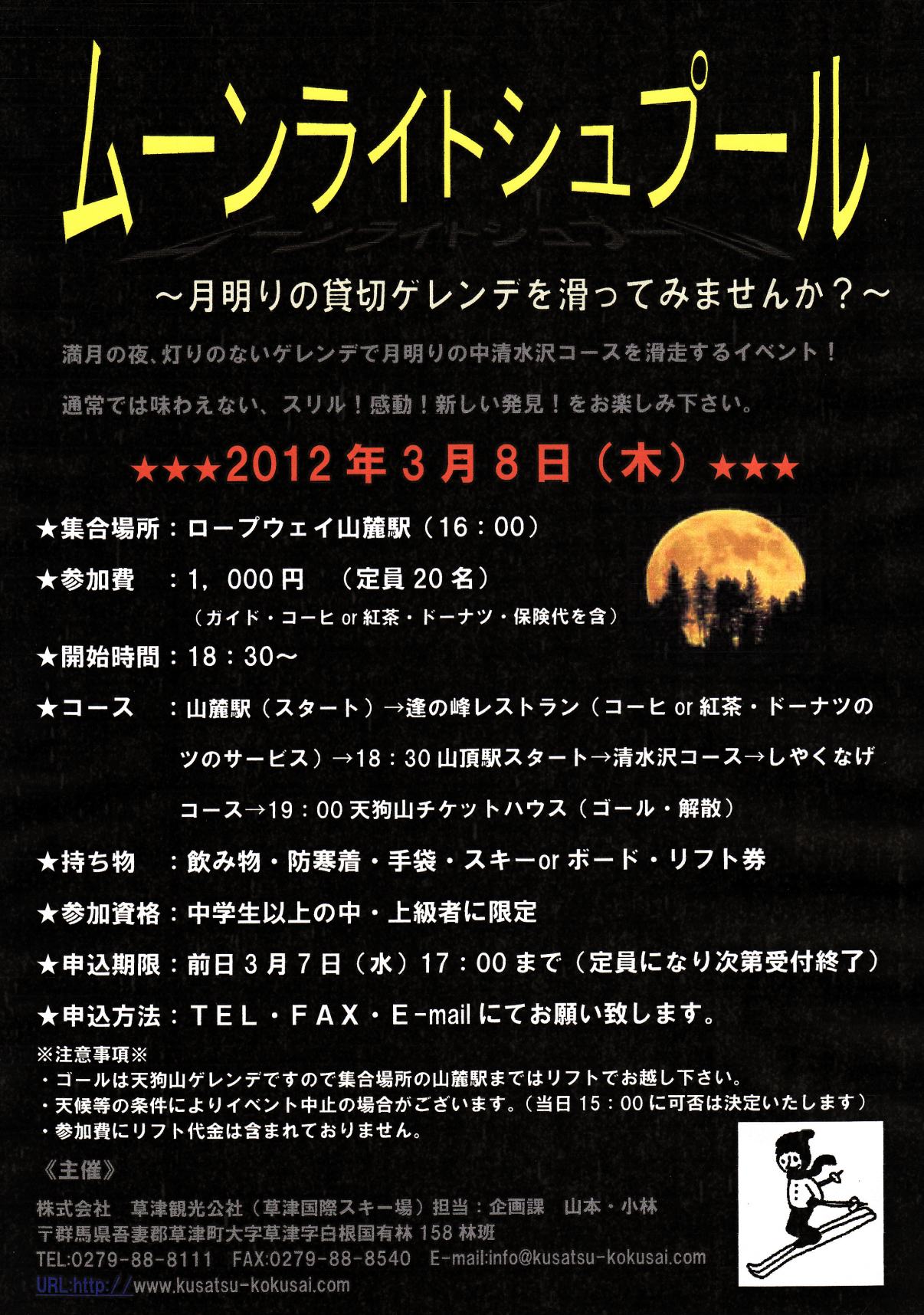 満月の夜、灯りのない貸切ゲレンデで月明かりの中、清水沢コースを滑走するイベントです!