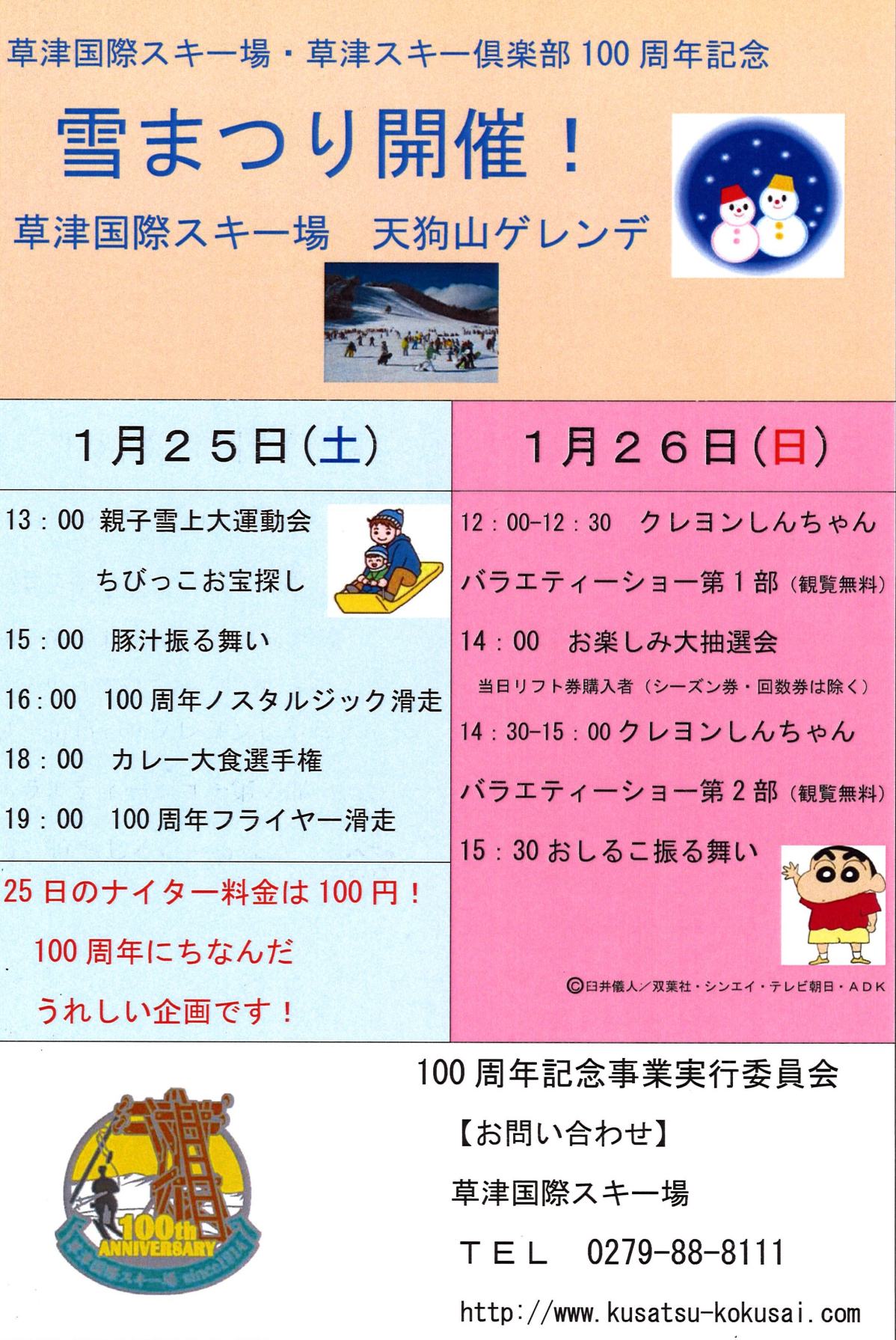 草津国際スキー場 開場100周年記念雪まつり By 草津スカイランドホテルIn イベント情報Posted 2014年1月21日0 Comment(s) 毎年、恒例となっております、草津国際スキー場の雪まつりですが、今年は100周年を迎えてのイベントです!いつもとは違う「雪まつり」となる事でしょう。 開催日は、1月25日(土)、26日(日)の2日間となります。 草津国際スキー場100周年にちなんで、なんと、1月25日(土)のナイターが100円! 雪まつりの内容は、以下の通りです。 是非、草津国際スキー場へ行こう♪ ポチッと、押して応援をお願いすますm(_ _)m ↓↓↓ ↓↓↓ 草津スカイランドホテル・栖風亭(せいふうてい)
