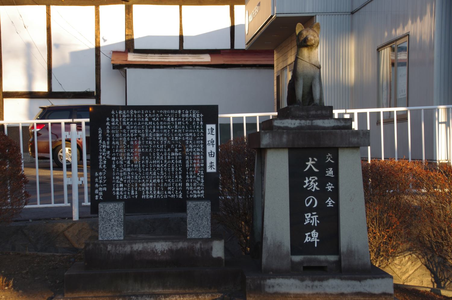 今もそのお宮がある。その犬は村の人達にますます愛されたが何年か後に死んだ。その亡がらを葬ったのが犬塚である。その後街道が開き時代とともに道路拡張、宅地造成などによって地形はすっかり変貌してしまったが、この地は犬塚の「小字名」耕地名として永久に公図に残されている。この地名と由来を永く後世に伝える為にこの碑を建てるものである。