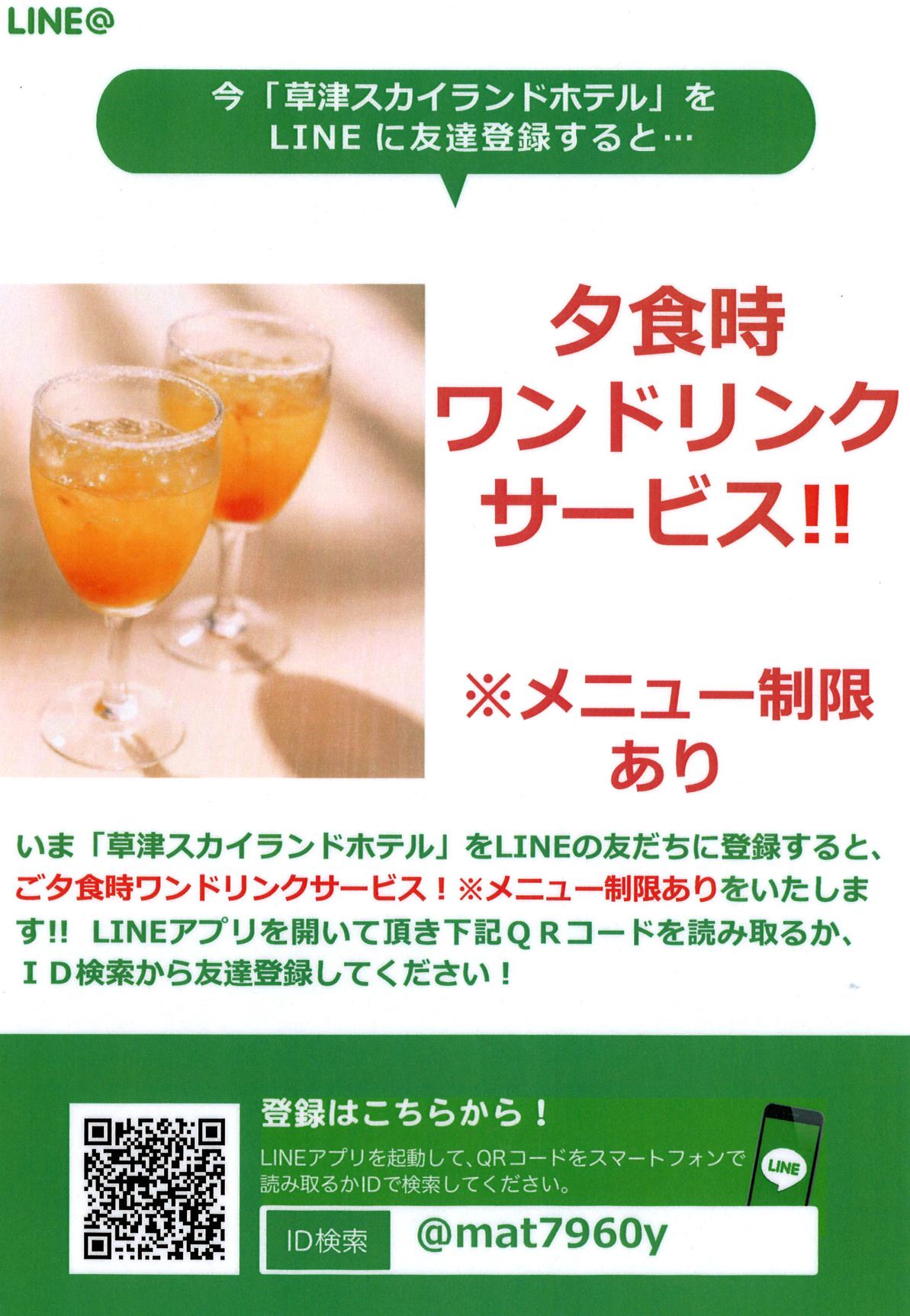 LINE アカウントを始めました By 草津スカイランドホテルIn お知らせPosted 2016年10月4日0 Comment(s) この度、LINEのアカウントで、草津スカイランドホテルを登録しました。 お友達リクエストしますと、クーポンをゲットした方お一人様につき、夕食時に、お酒、または、グラスワイン、または、ソフトドリンクのサービスがございます。 館内のポップチラシにQRコードが記載されておりますので、スマホで読み込めば、簡単にクーポンがゲット出来ます。 とっても簡単です。 当館にお泊りの際は、ぜひ、お友達登録をしてください。 ポチッと、押して応援をお願いすますm(_ _)m ↓↓↓ ↓↓↓ 草津スカイランドホテル・栖風亭(せいふうてい)