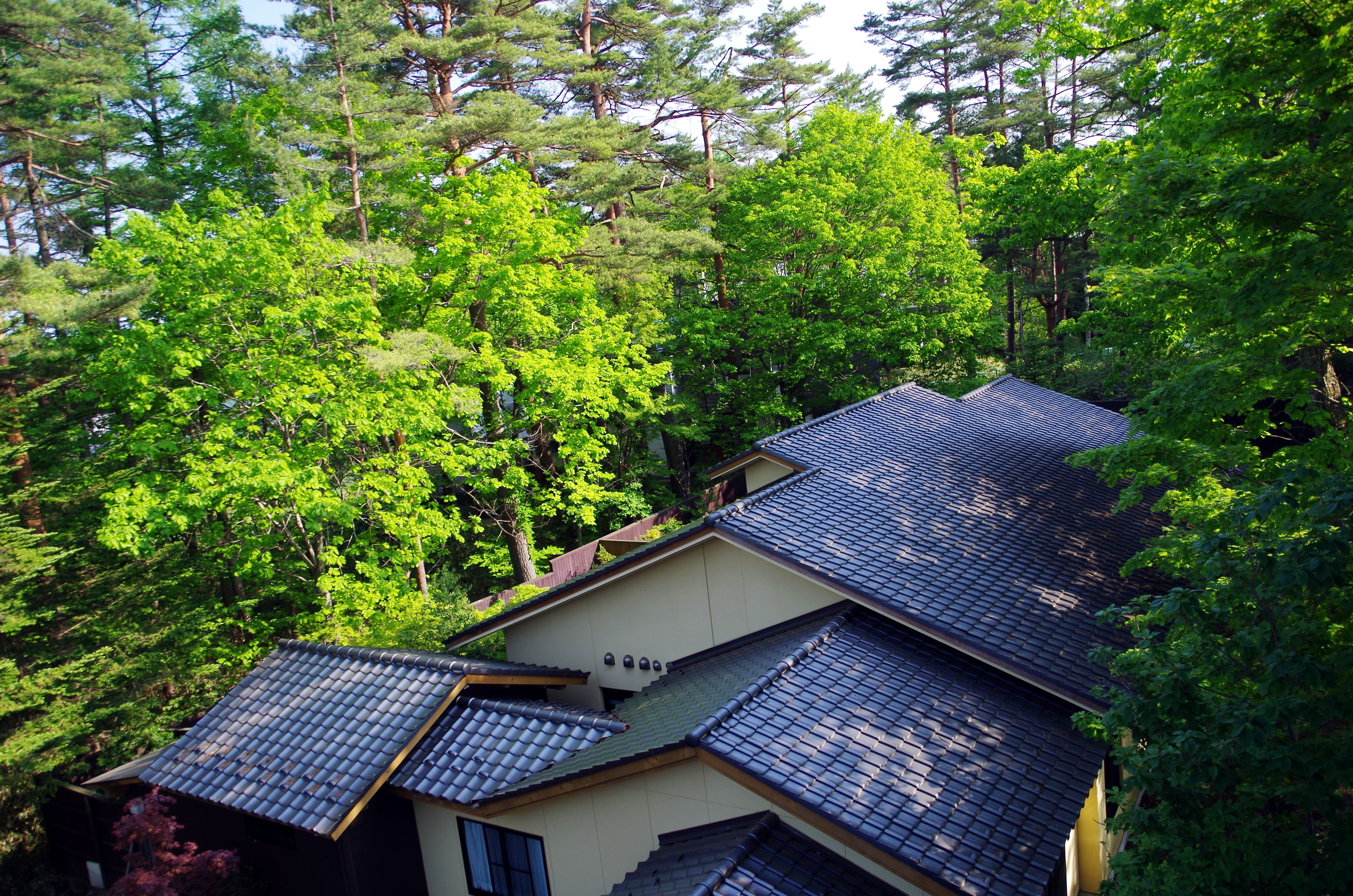 木立に囲まれた大浴場外観。