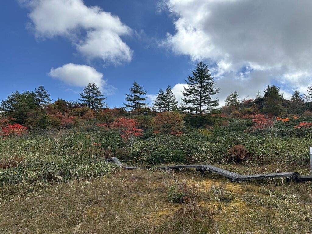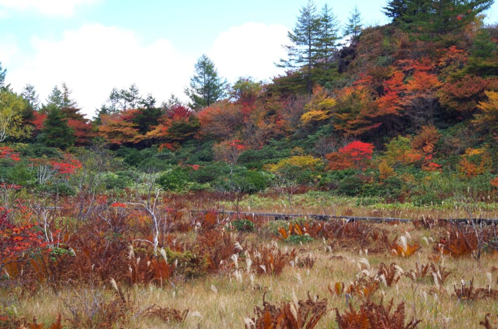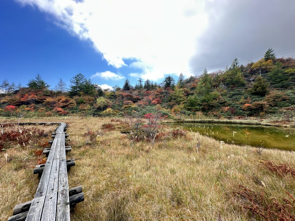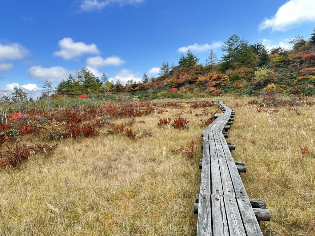 武具脱の池を囲む木道を歩けば、澄んだ空気の中で草の香りと秋の風が頬を撫で、