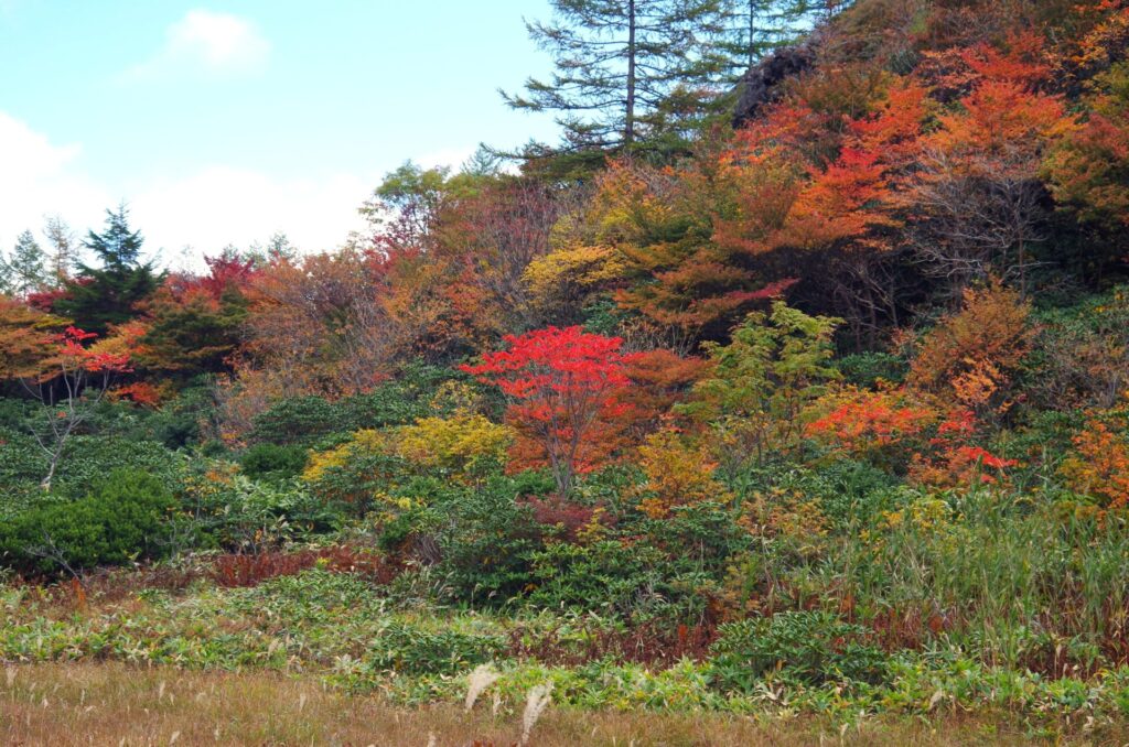 赤・黄・橙のグラデーションが斜面一面を覆い、風に揺れるススキとともに、