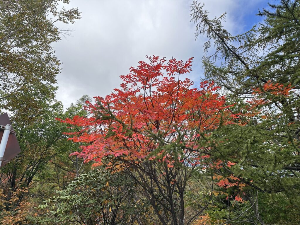 道中には、真紅のナナカマドやオレンジ色に染まるカラマツの並木など、