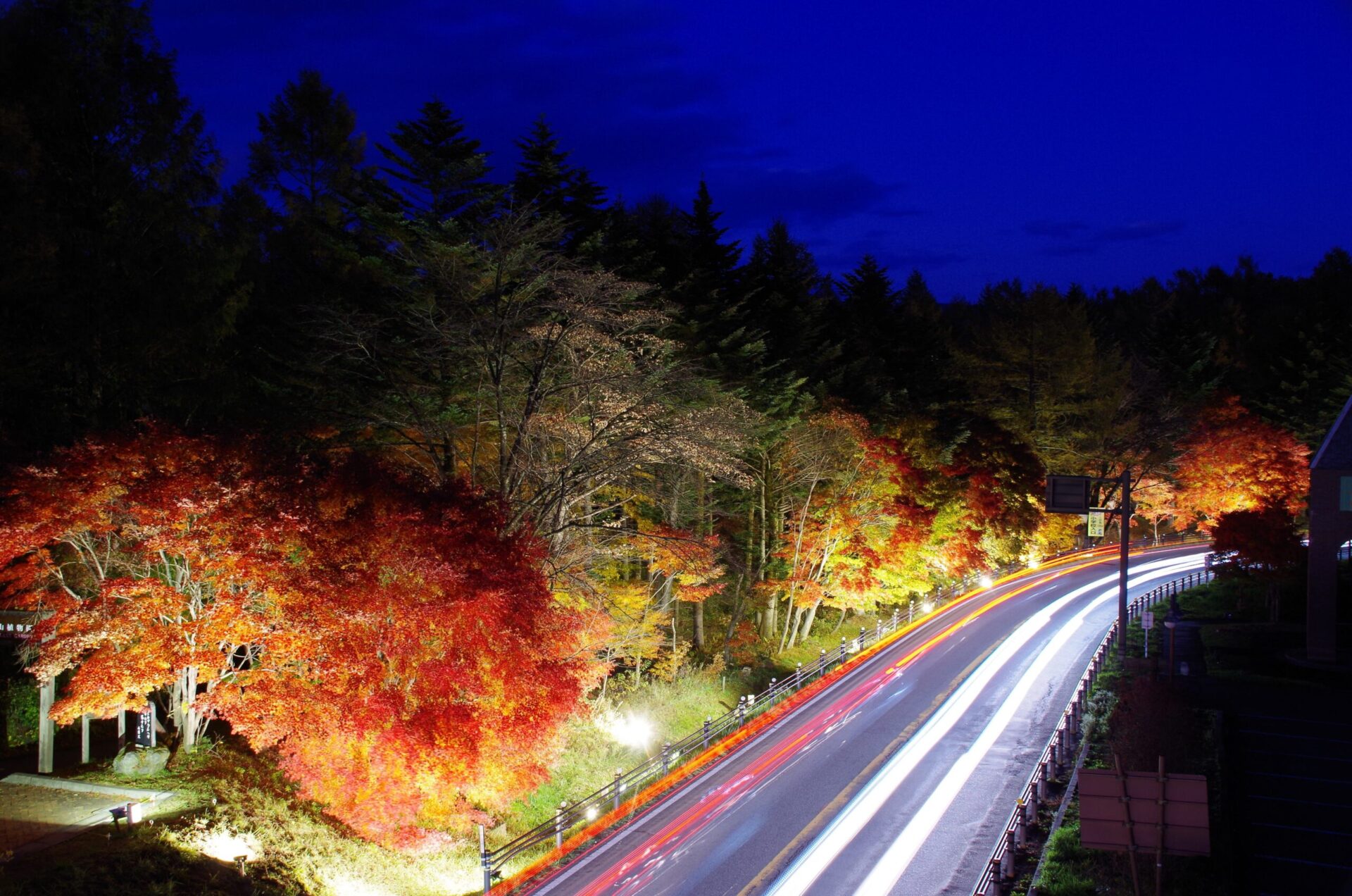夜空の紺と紅葉の橙が織りなすコントラストは、