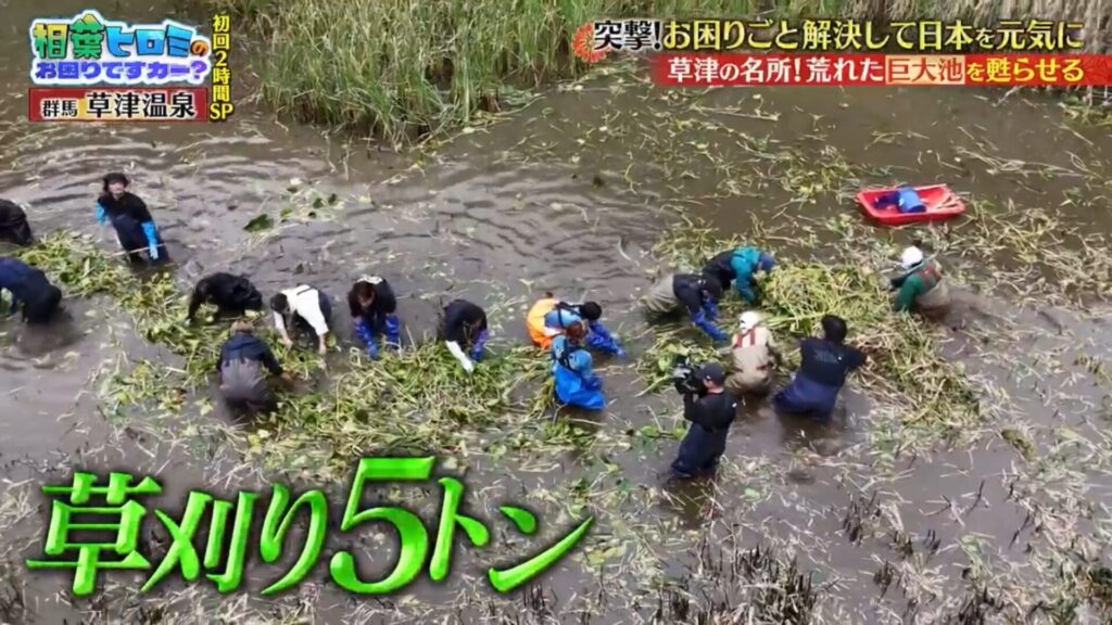 そして草津町の皆さんが一丸となり、池に繁茂した草を取り除く大作業を実施。