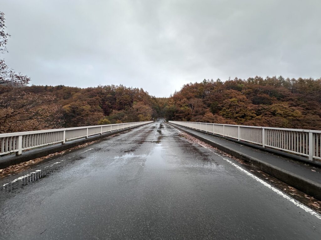 谷沢橋から眺める山々は少しピークを過ぎつつありますが、それでもなお秋の名残を感じさせる深い色合いが楽しめます。