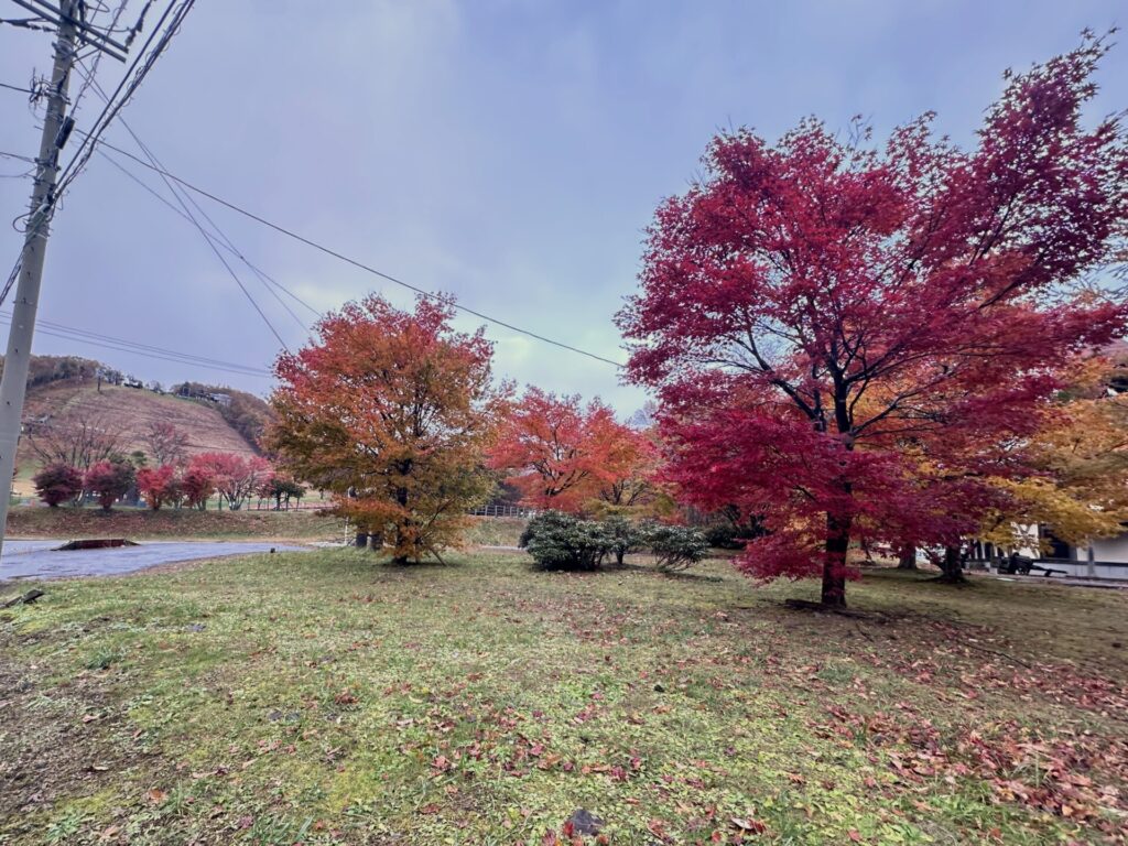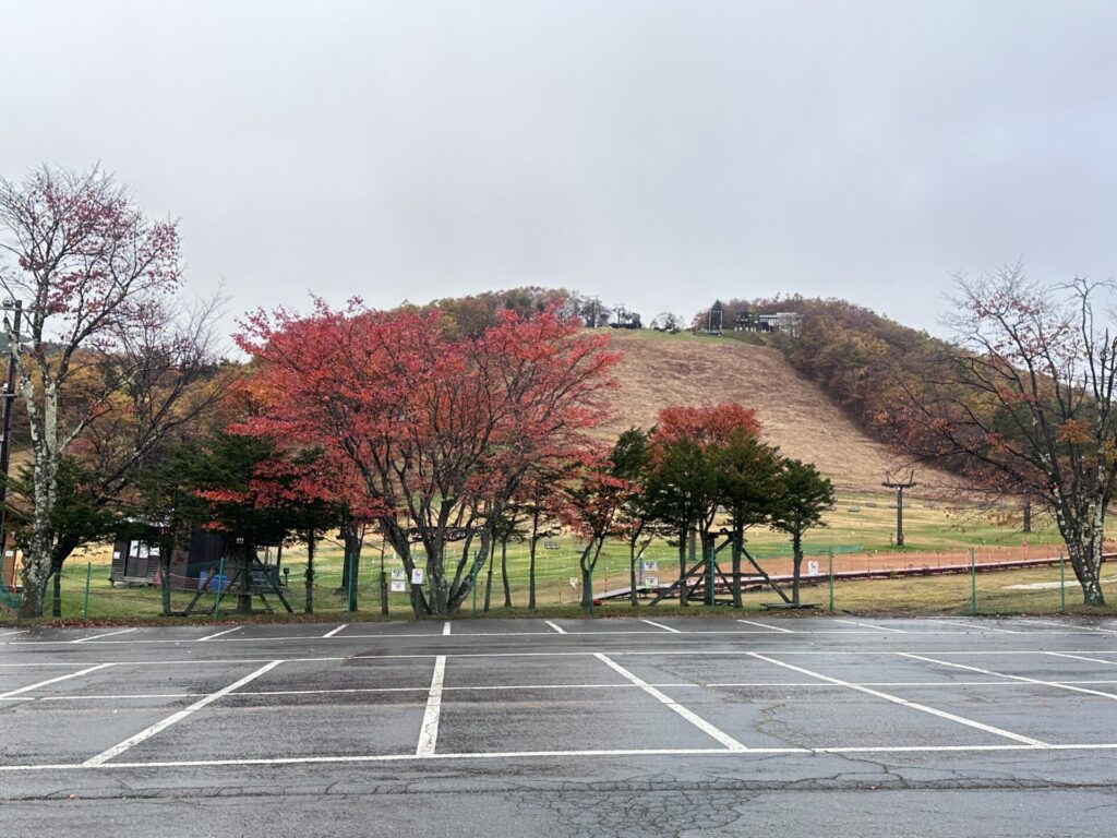 ゲレンデの斜面や駐車場のあたりから見上げると、紅や橙、黄のグラデーションが山肌を彩り、晩秋ならではの情景が広がります。