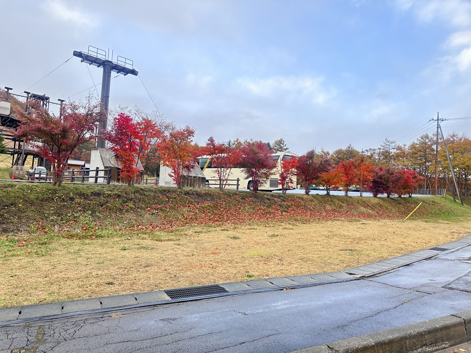 ゲレンデの斜面や駐車場のあたりから見上げると、紅や橙、黄のグラデーションが山肌を彩り、晩秋ならではの情景が広がります。