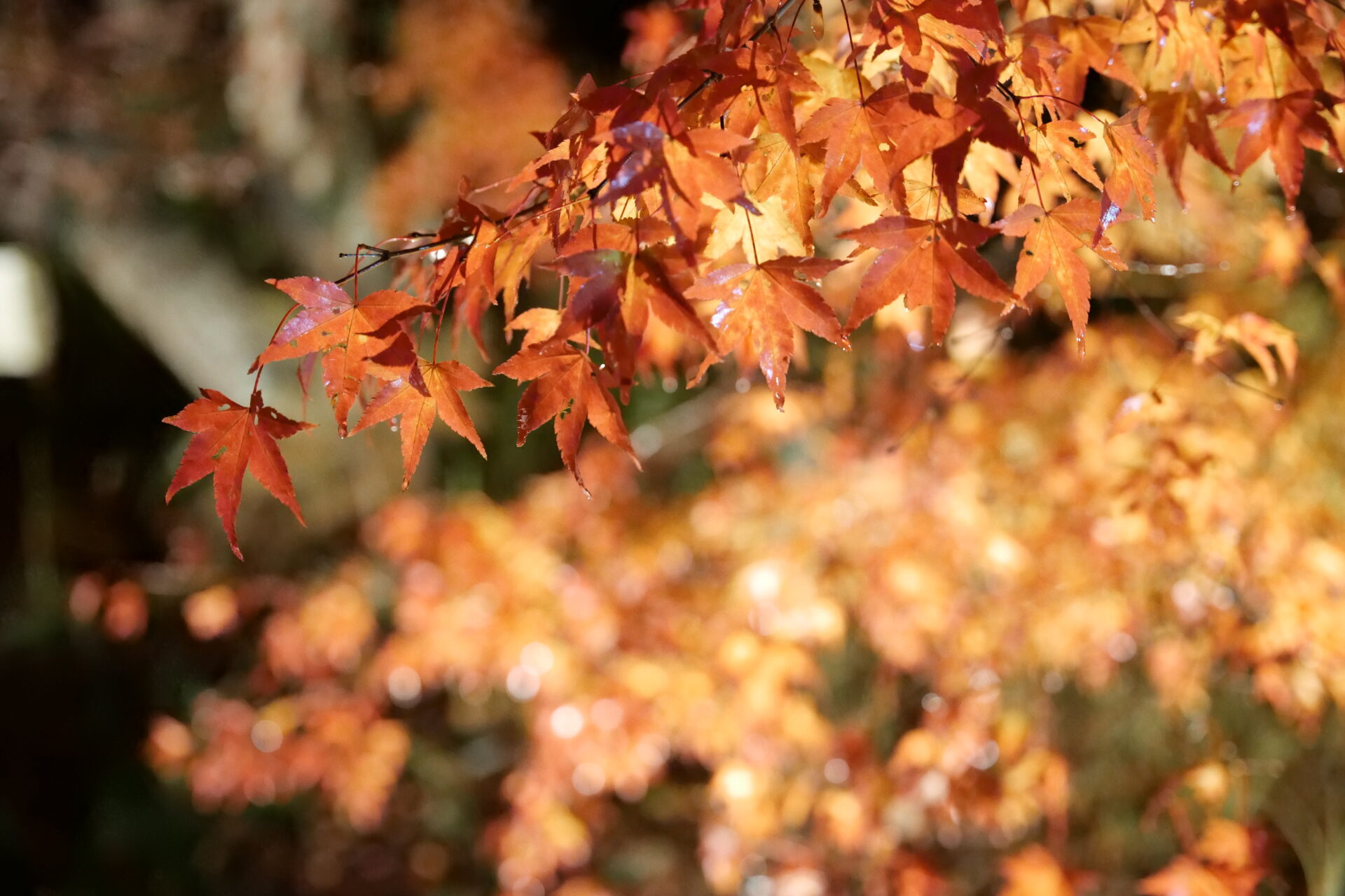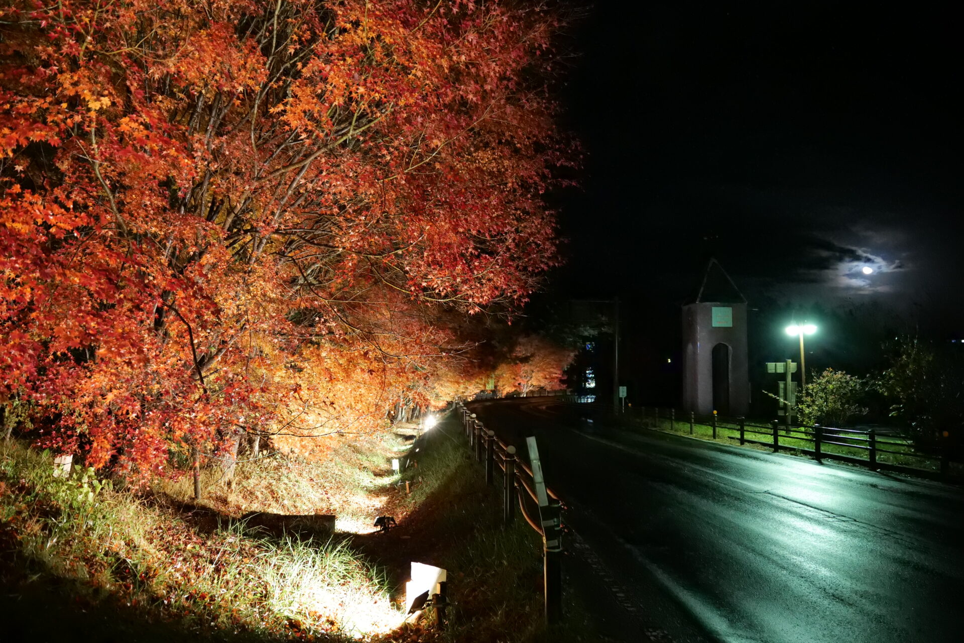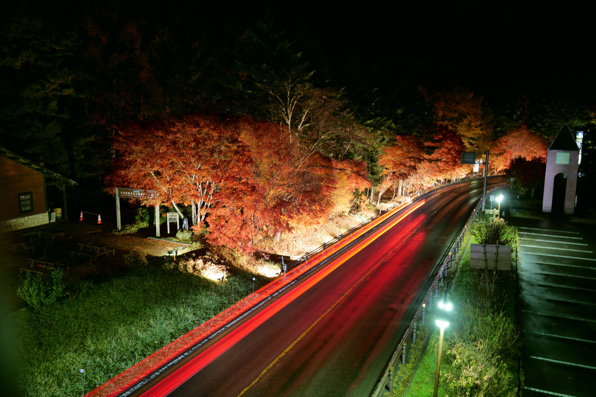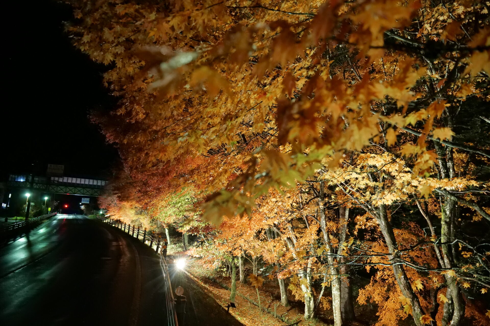 車のライトが通るたび、光の帯が紅葉をより一層引き立て、