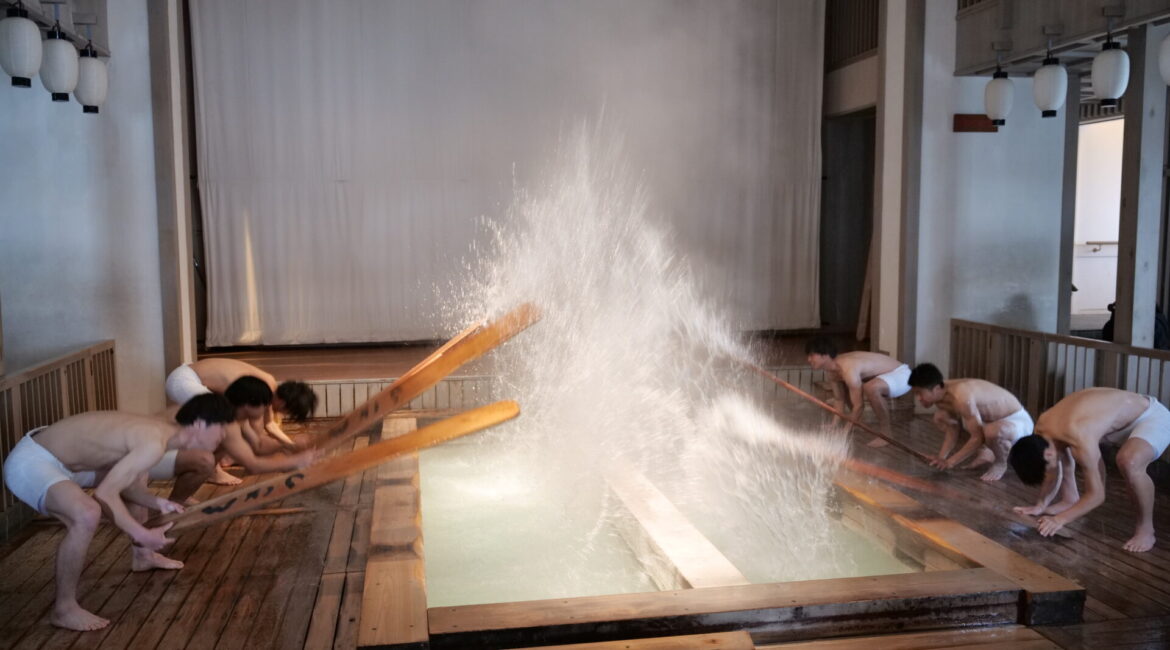 実演が始まると、木の板が湯面を叩く軽やかな音、湯けむりが立ち昇る白い光景、