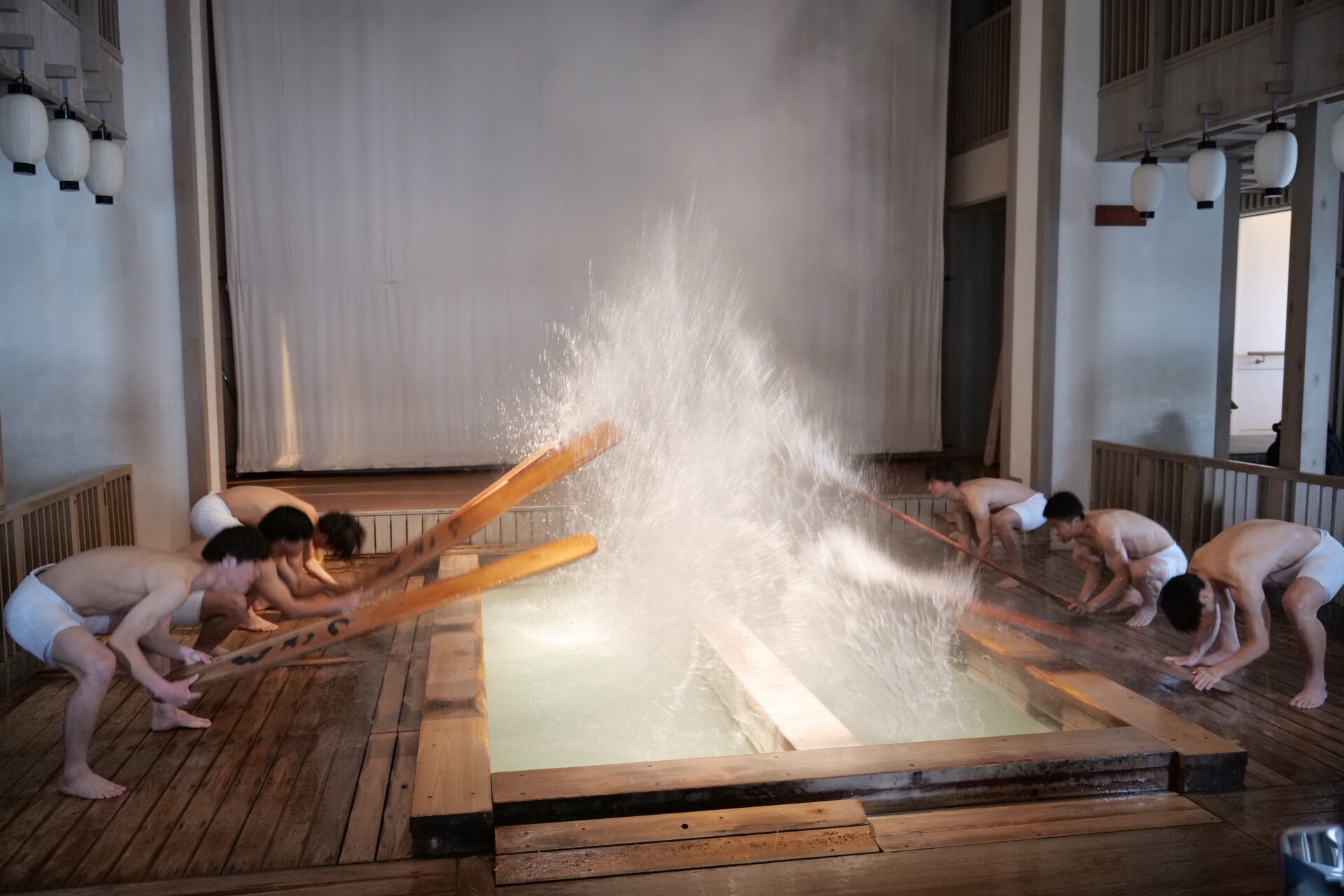 実演が始まると、木の板が湯面を叩く軽やかな音、湯けむりが立ち昇る白い光景、