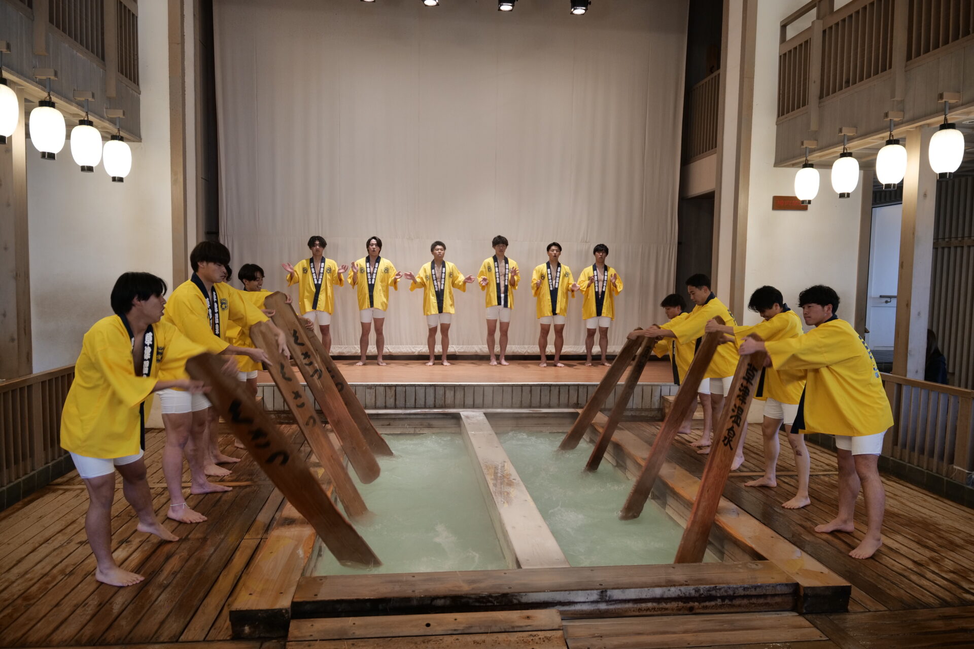 スポーツで鍛えられた体幹と、息の合ったチームワークが光る湯もみは、