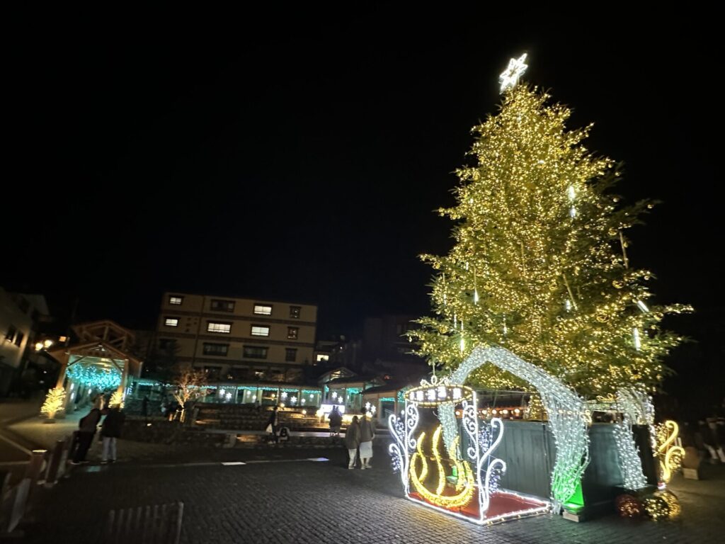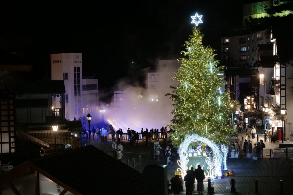 ツリー全体を包む柔らかな光は、温泉地ならではの湯けむりと絶妙に溶け合い、