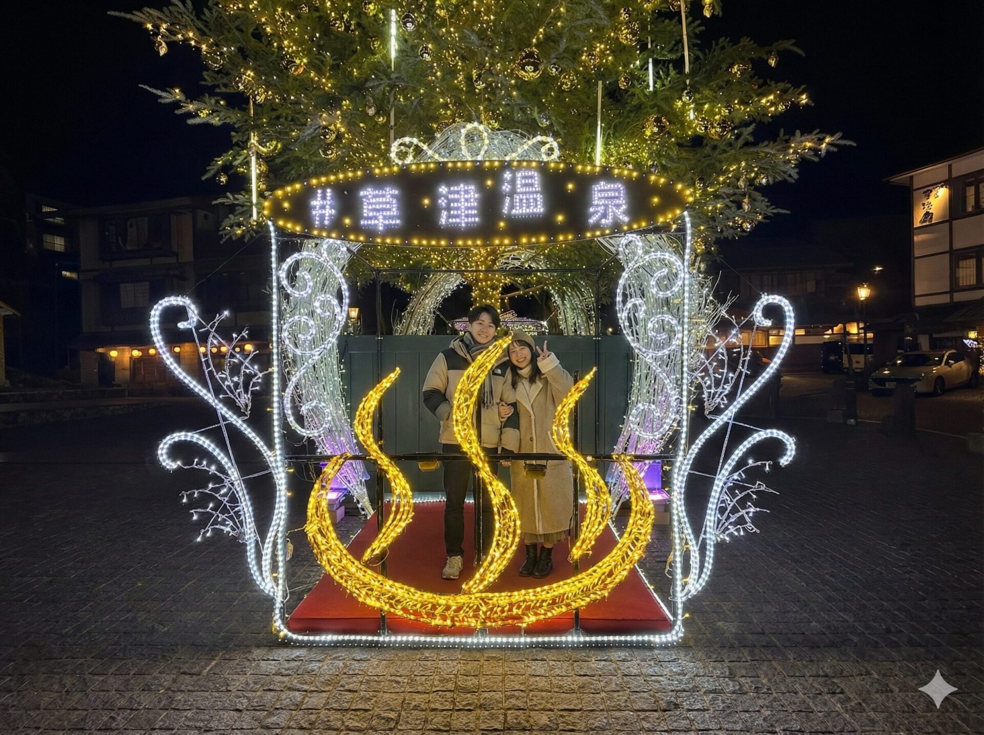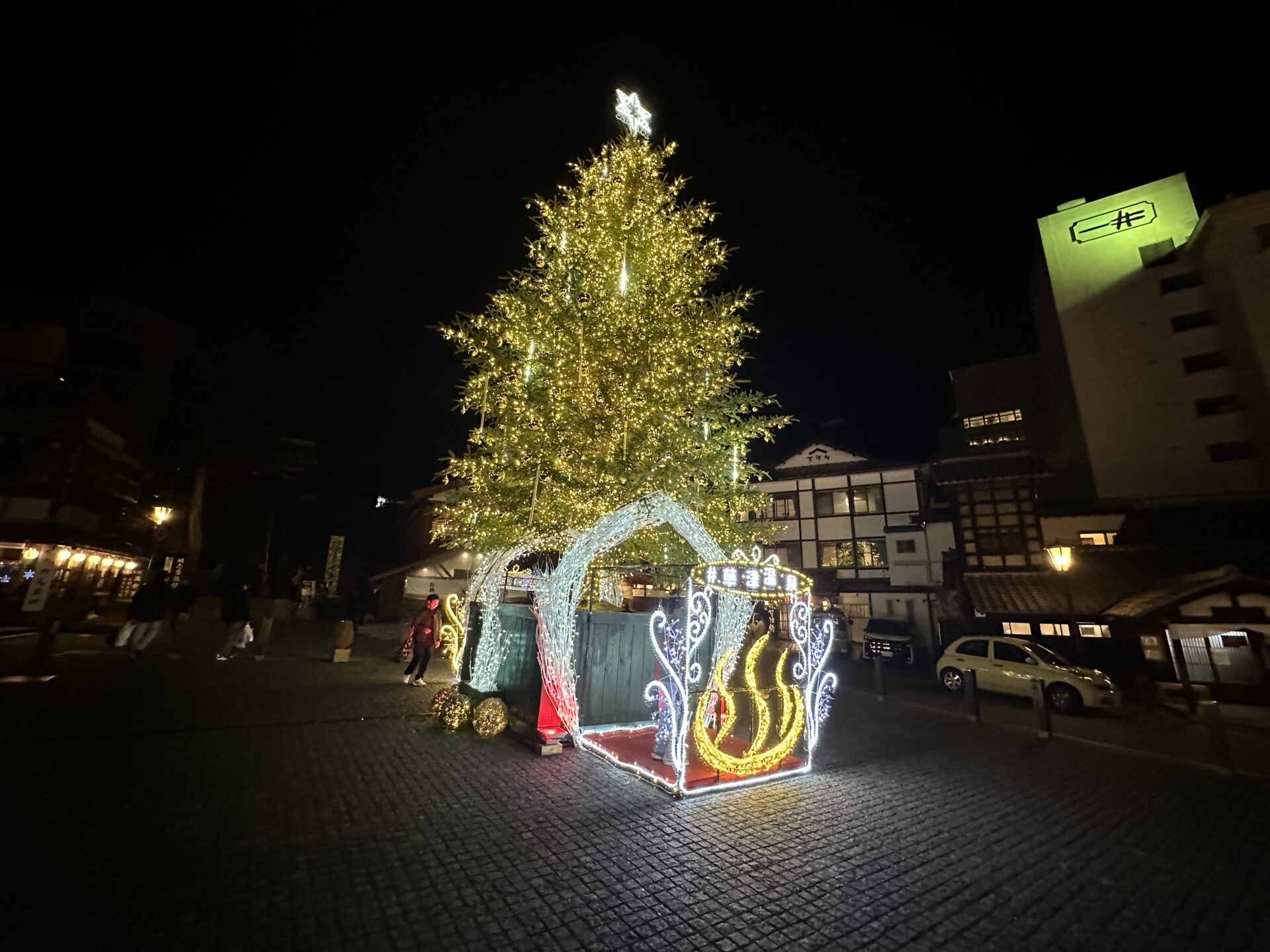 ツリー全体を包む柔らかな光は、温泉地ならではの湯けむりと絶妙に溶け合い、