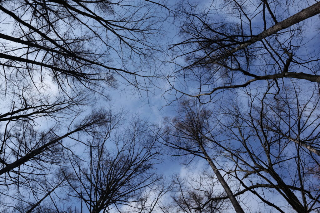 晩秋のいま、森の中では多くの葉が落ち、頭上を見上げると、
