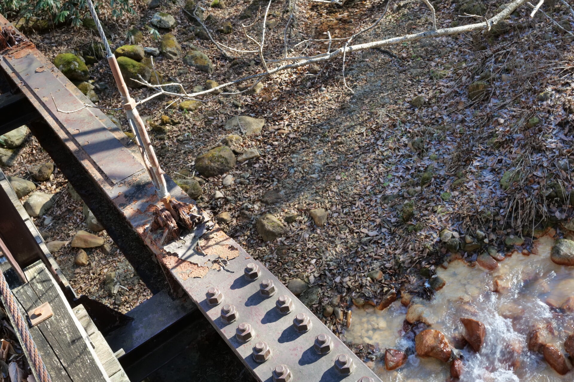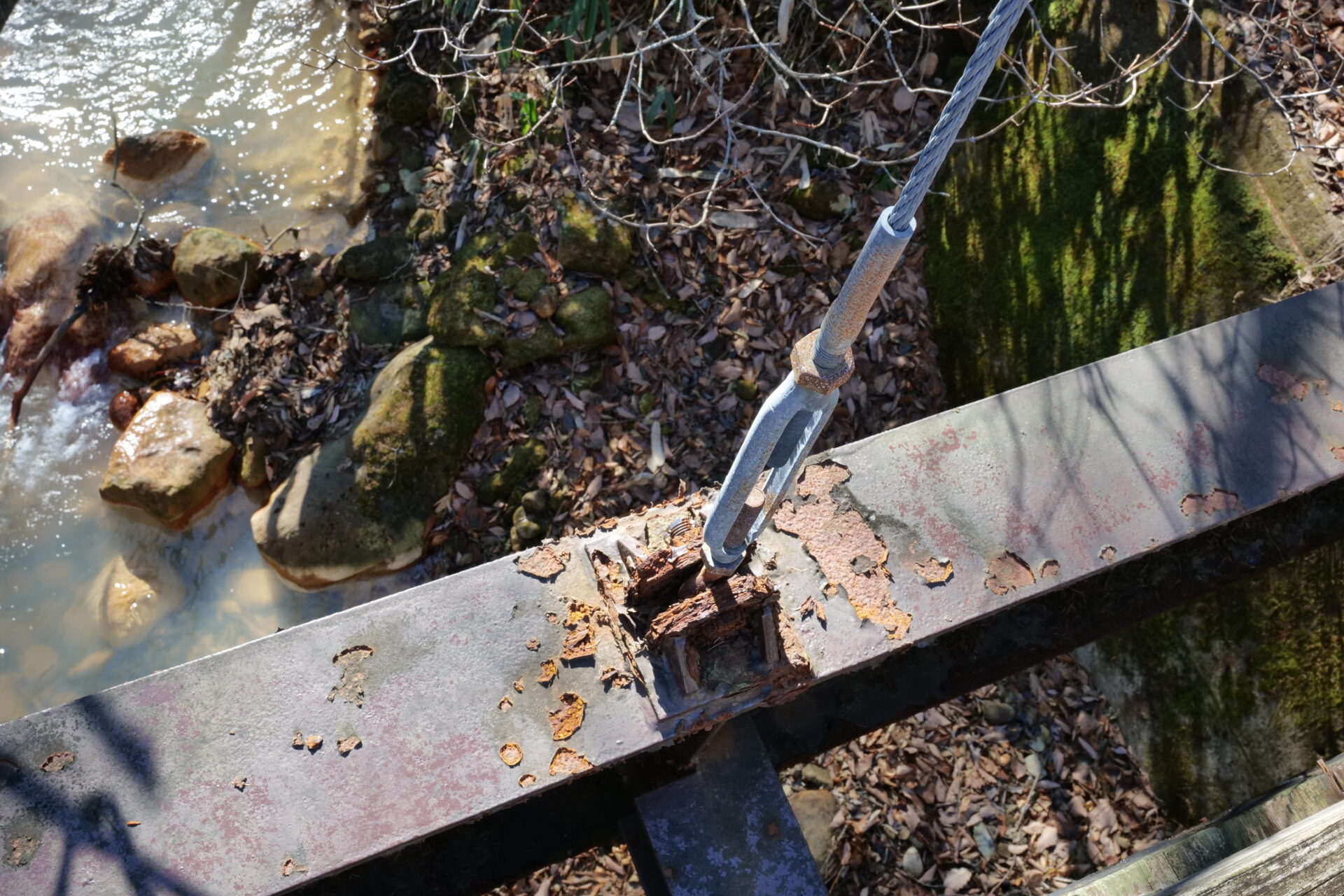 実際に橋を確認してみると、ワイヤーロープには広範囲に錆が広がり、