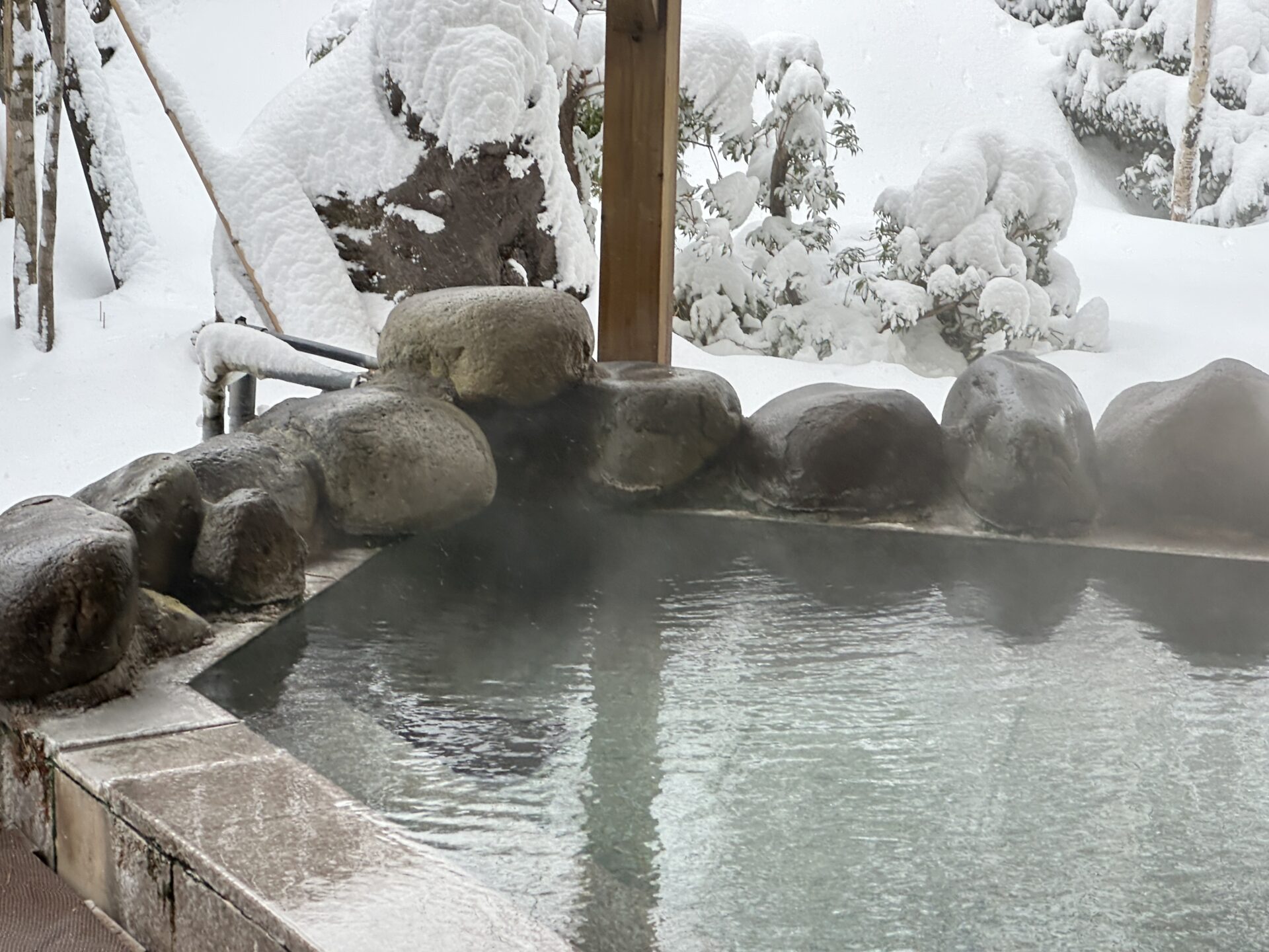 立ちのぼる湯けむりの先には、雪をまとった木々や石が静かに佇み、