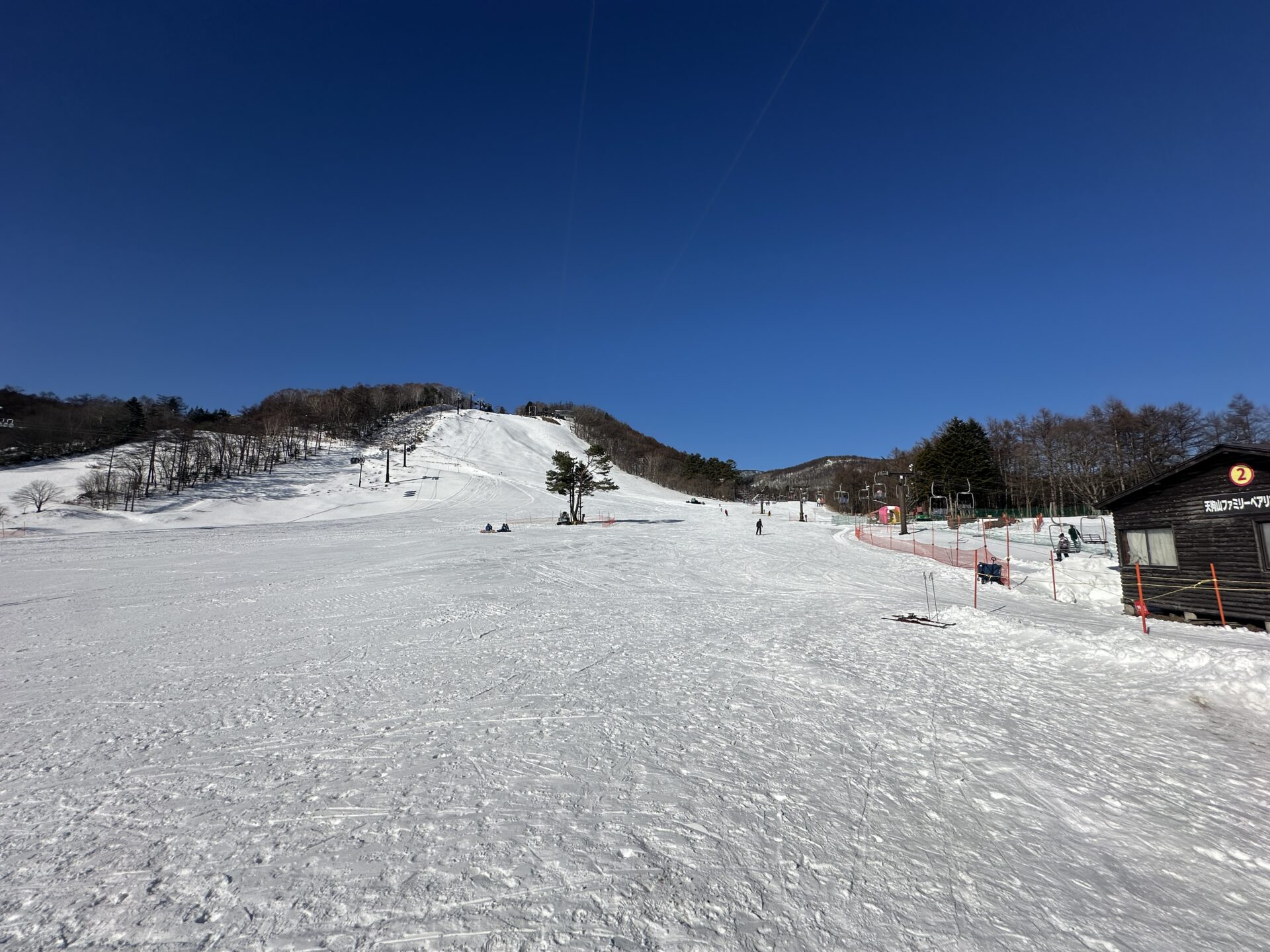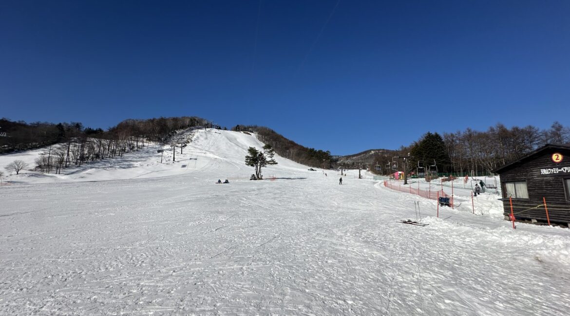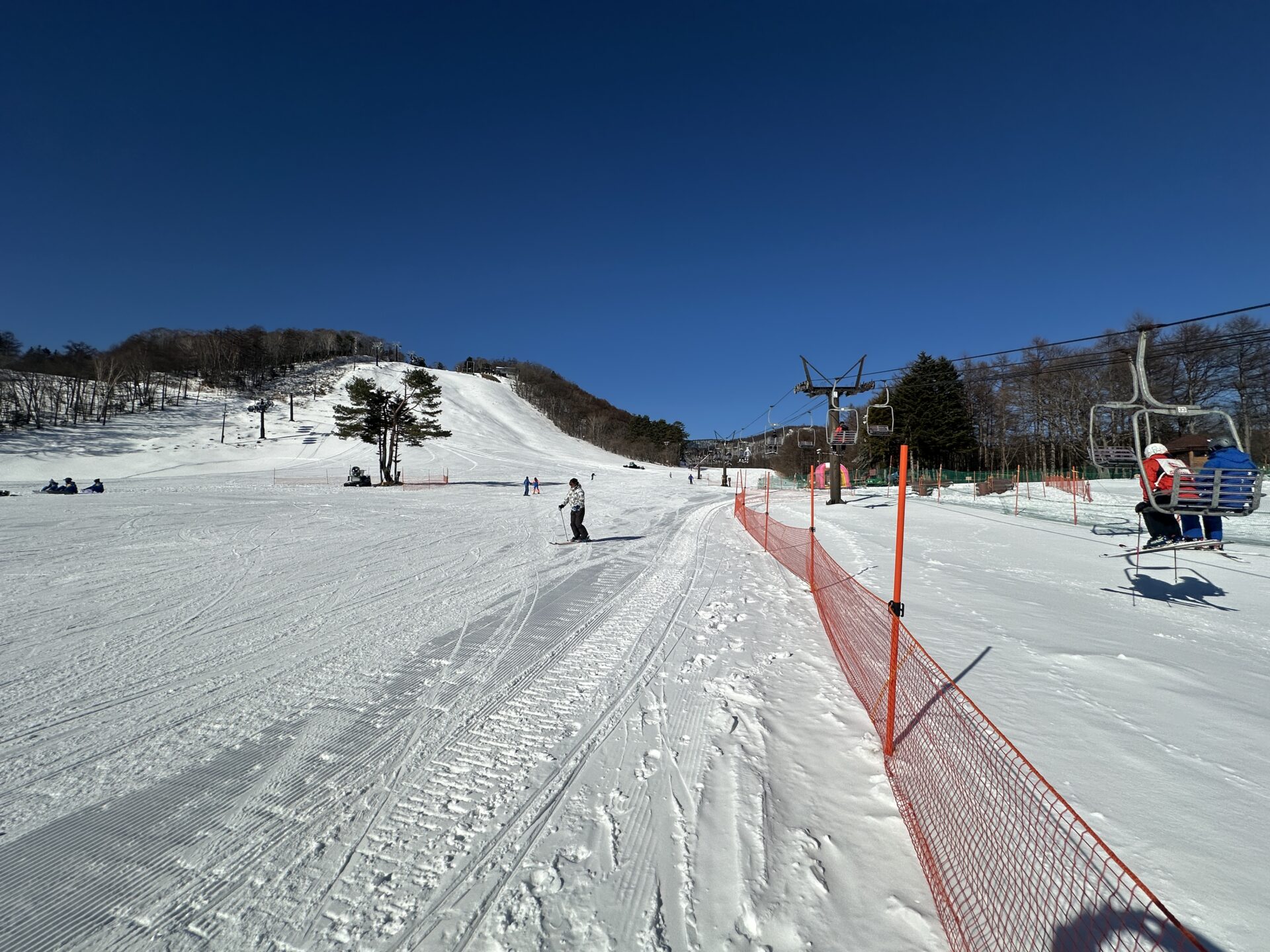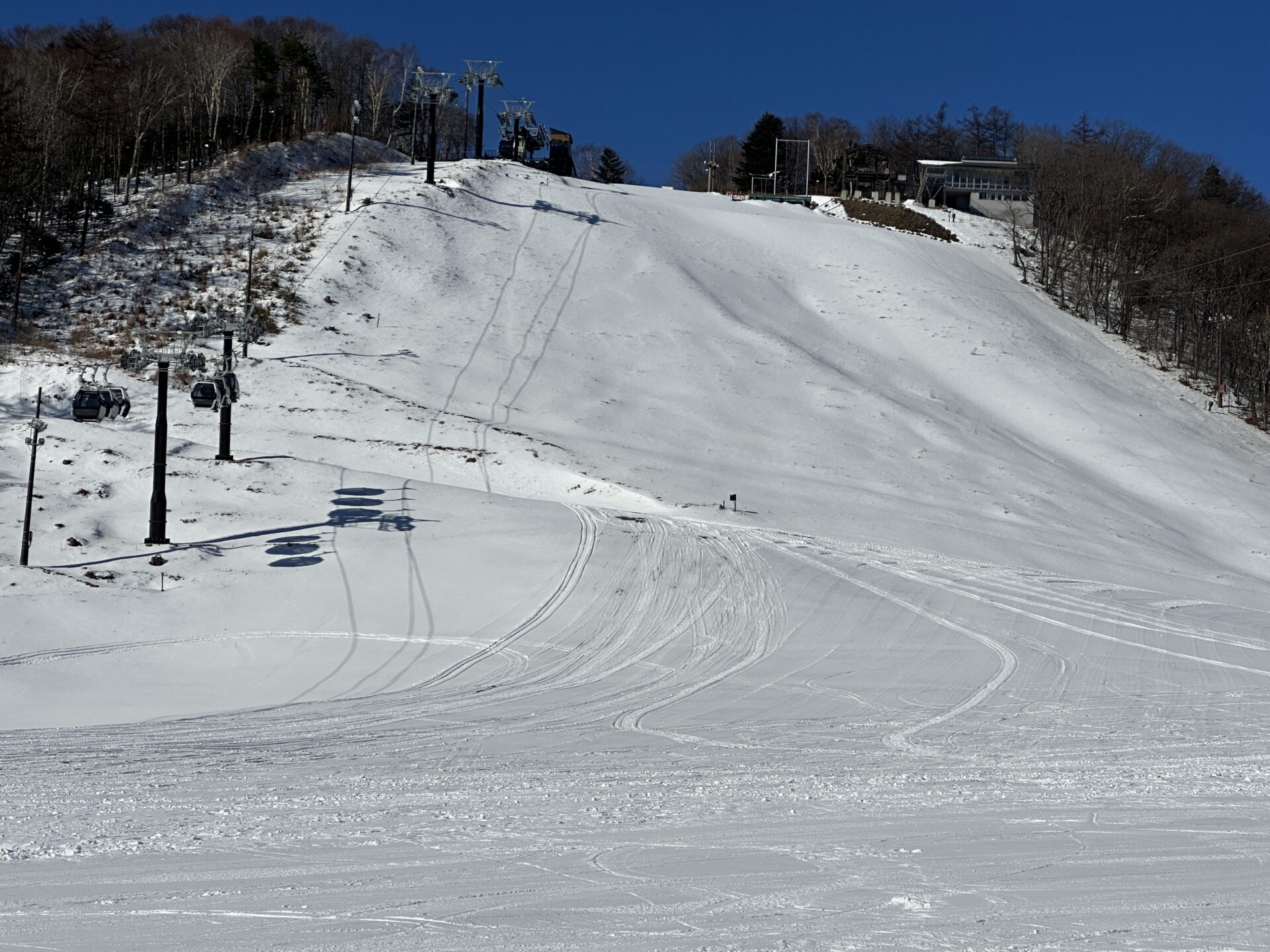 澄み切った青空と、陽の光を受けてきらめく白銀のゲレンデが見事なコントラストを描き、