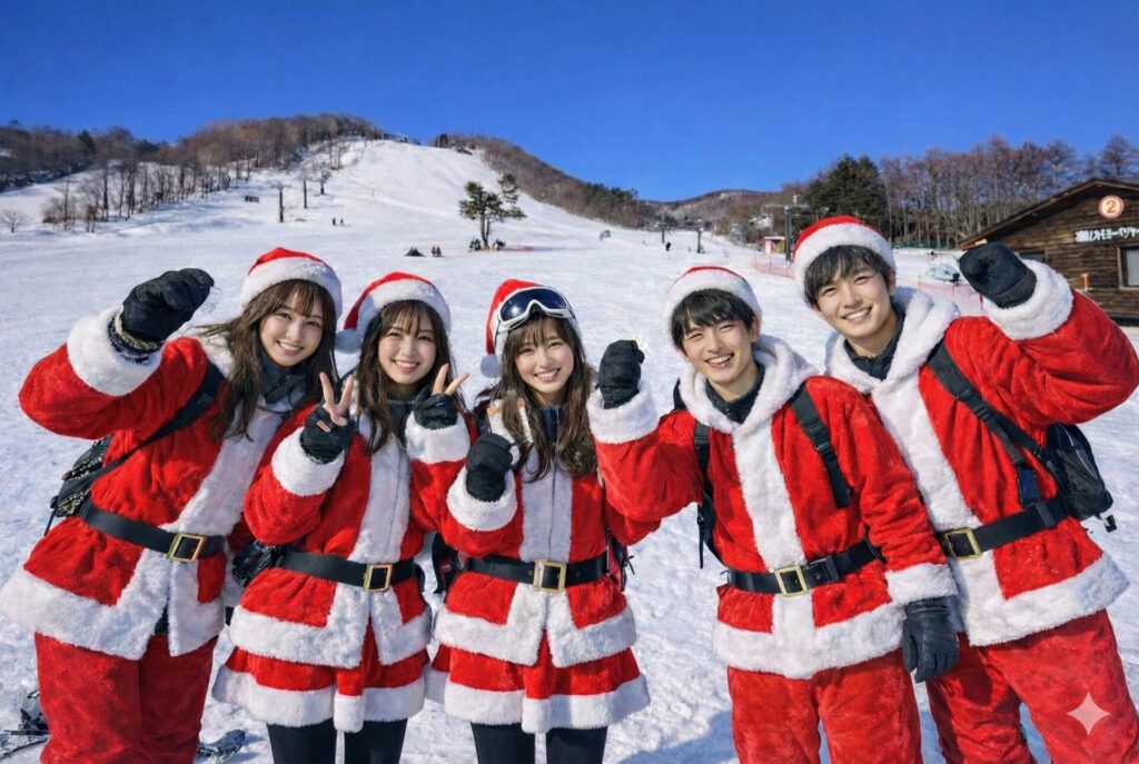 サンタ姿で滑るゲレンデは、いつもとは違う特別な楽しさに包まれます。