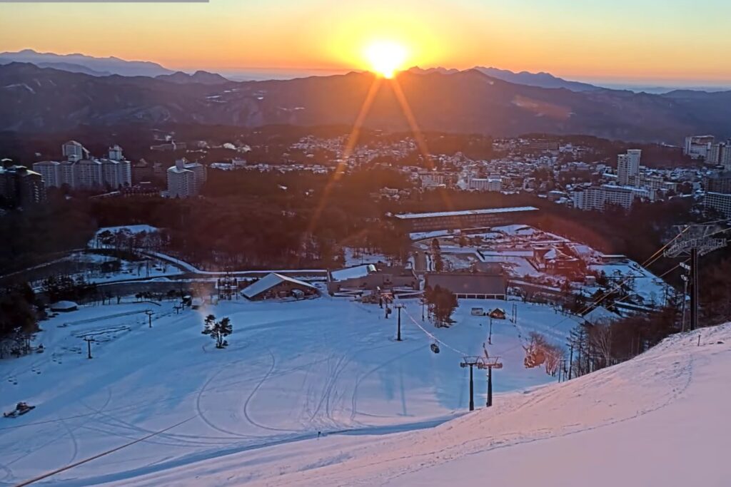 山々の稜線からゆっくりと昇る朝日は、雪景色の草津温泉街をやさしく照らし出します。