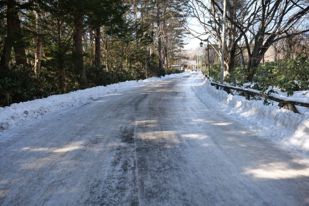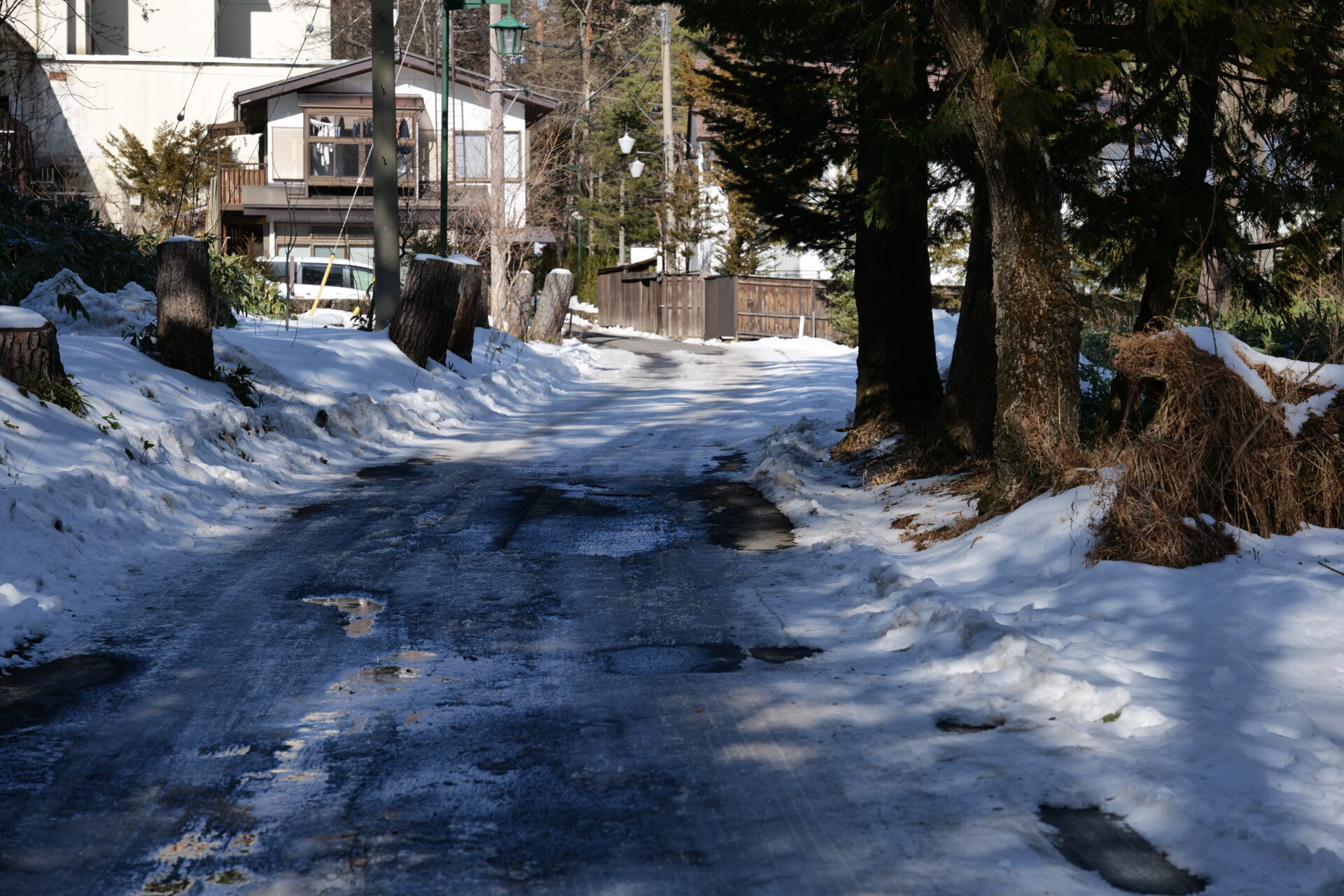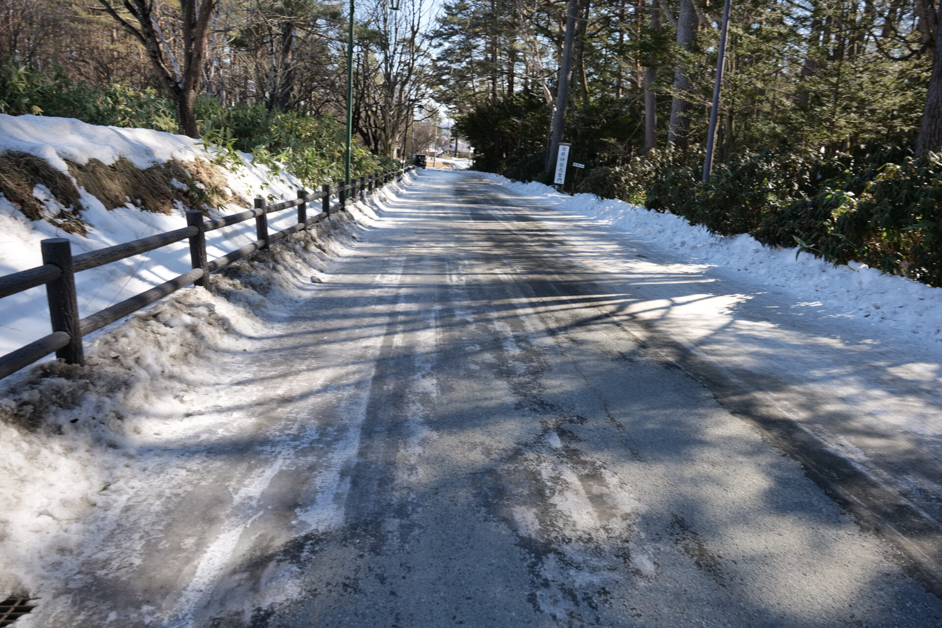 脇道や日陰になっている場所では、まだ雪や氷が残っております。