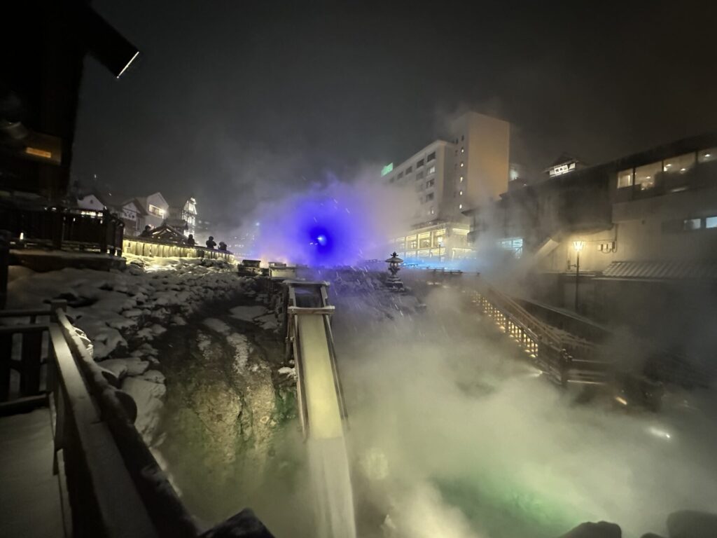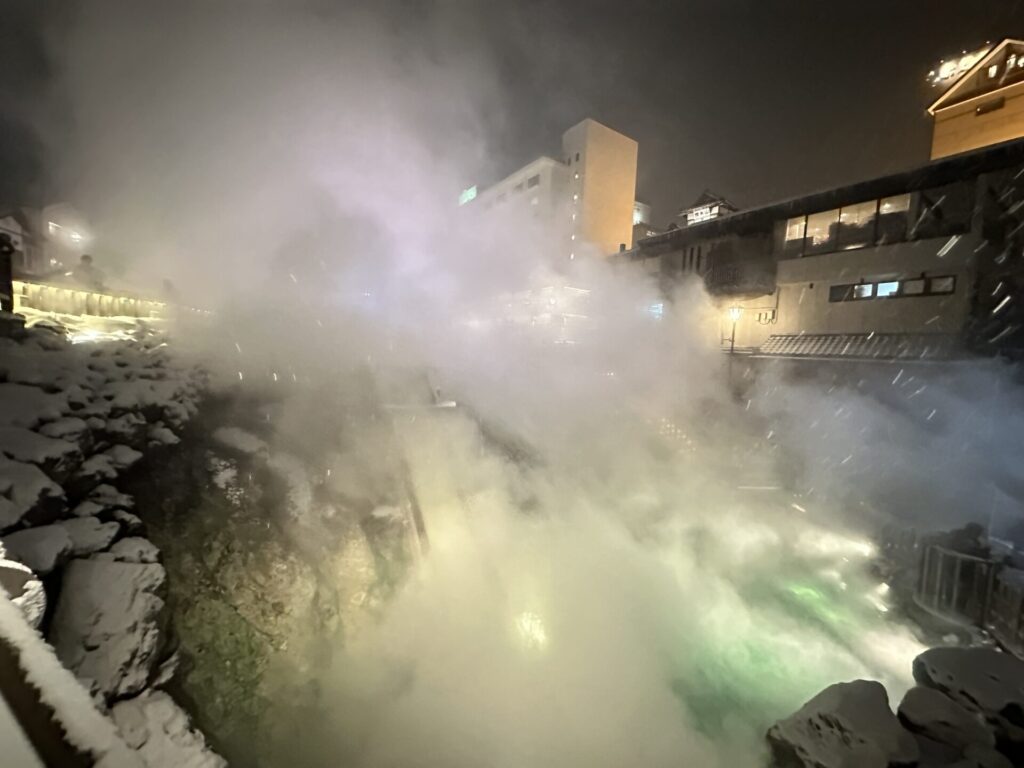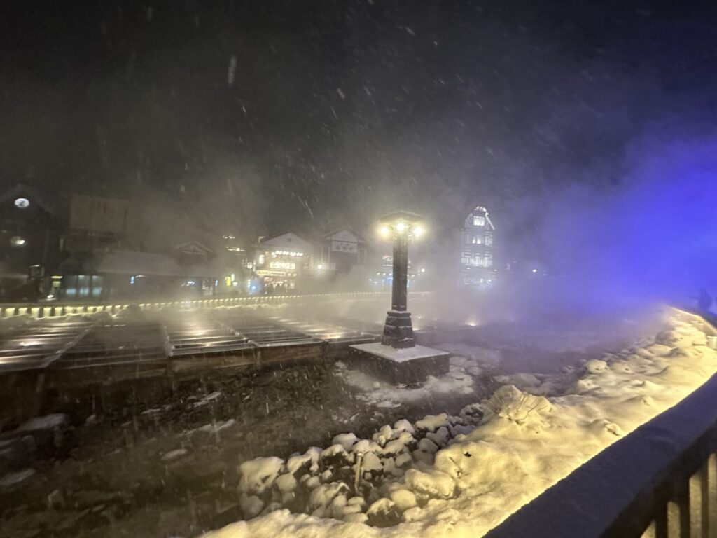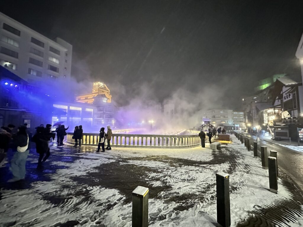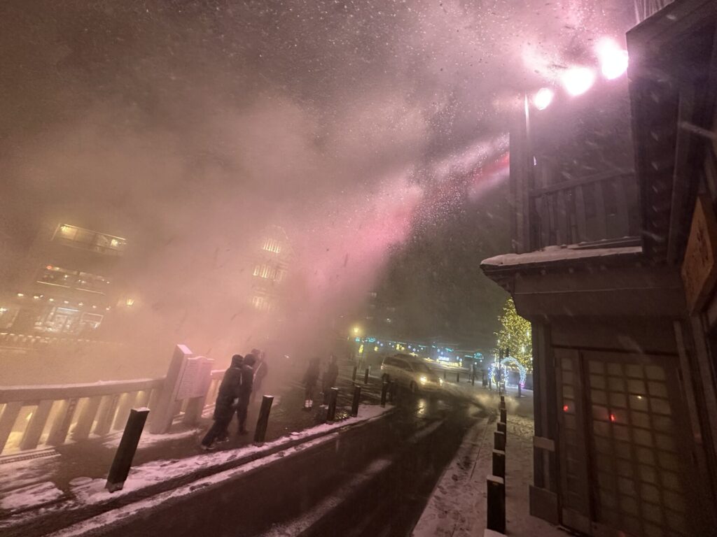 これらが重なり合い、冬の湯畑ならではの幻想的な景色が完成します。