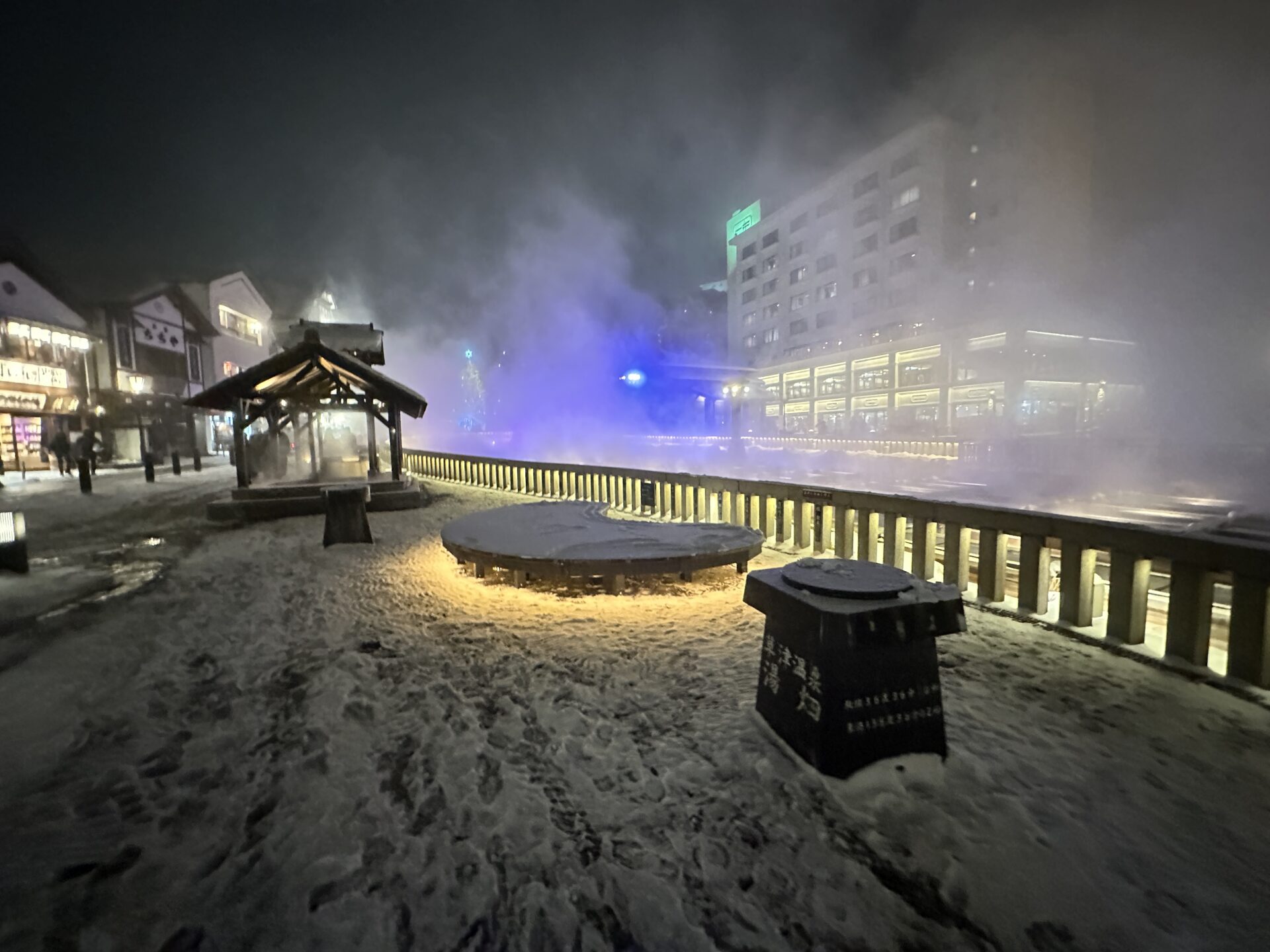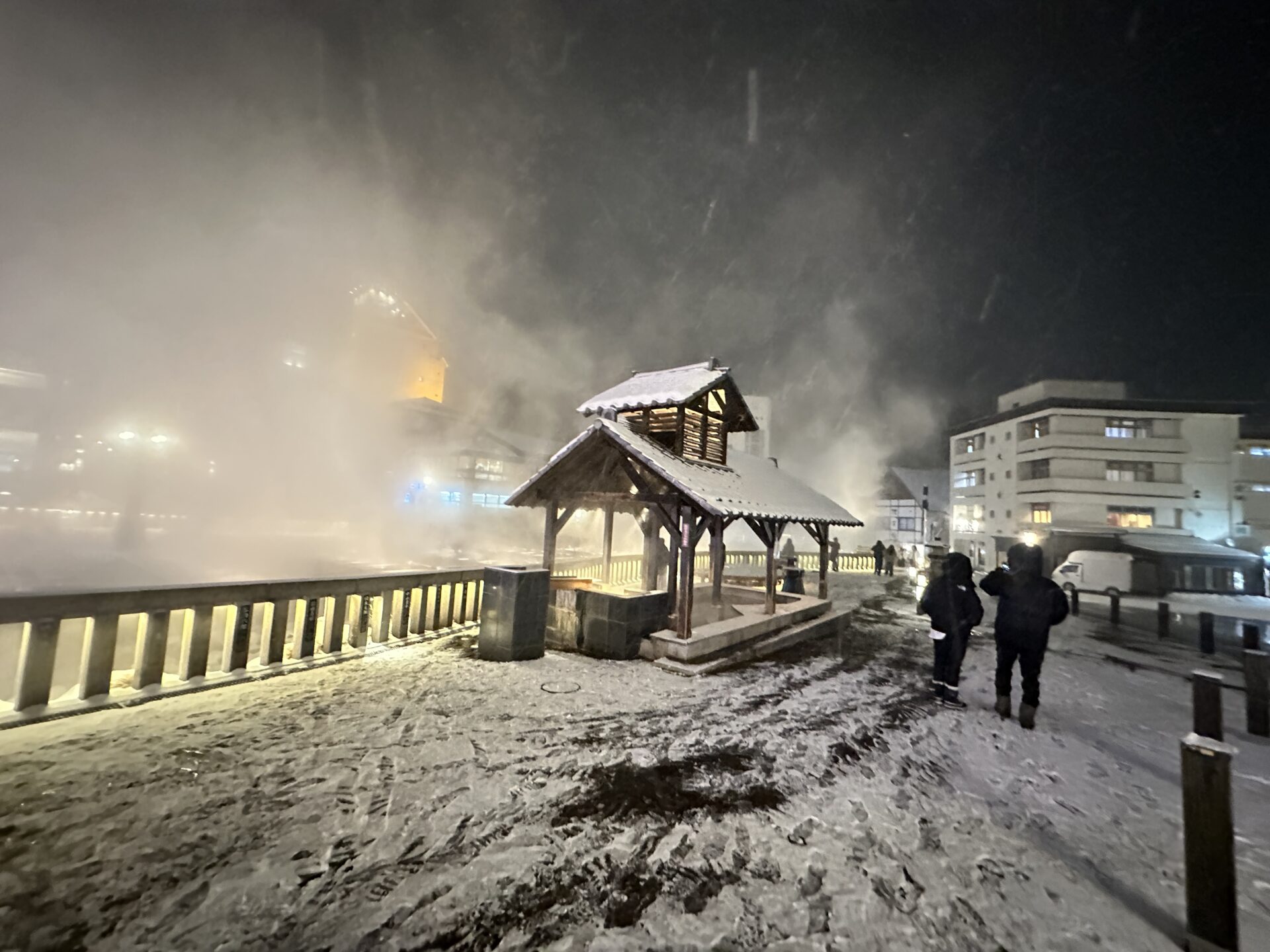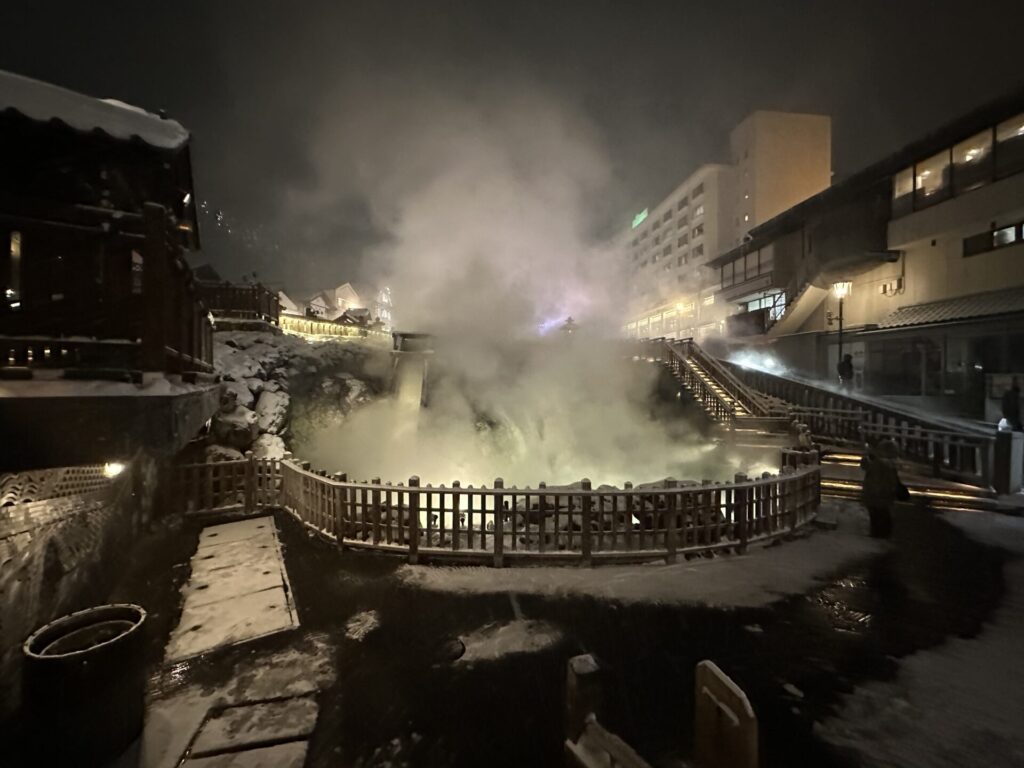 これらが重なり合い、冬の湯畑ならではの幻想的な景色が完成します。