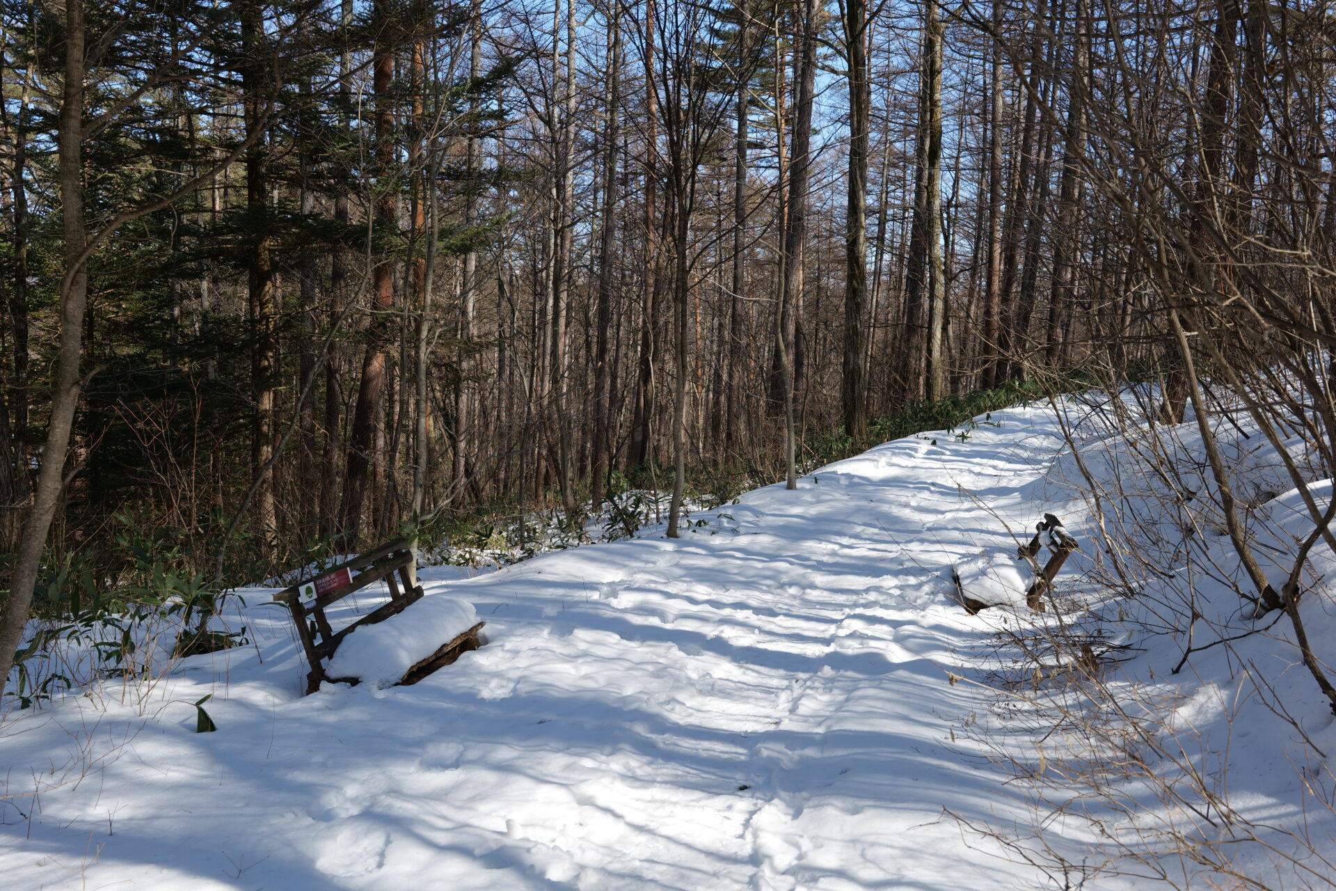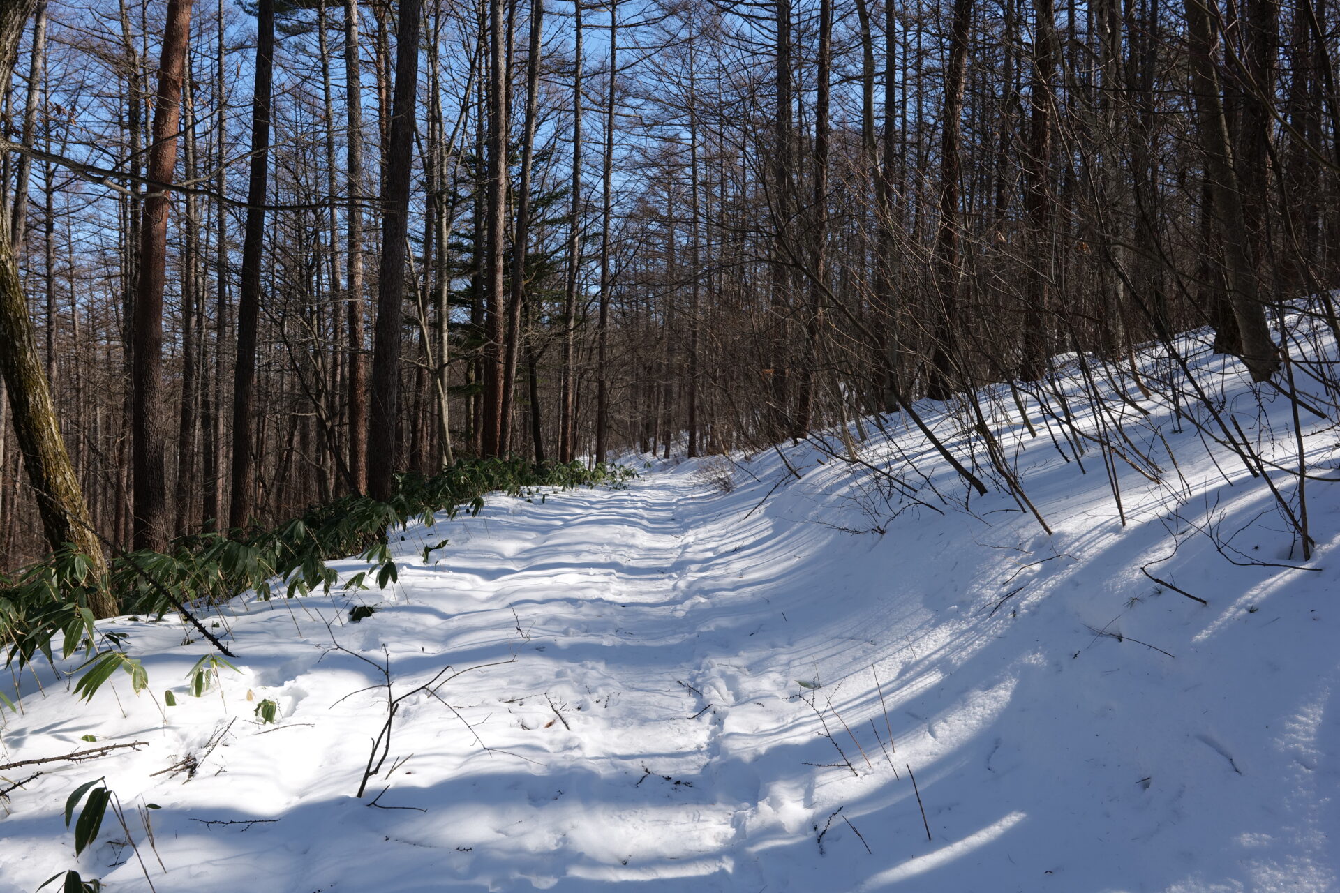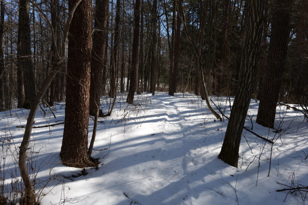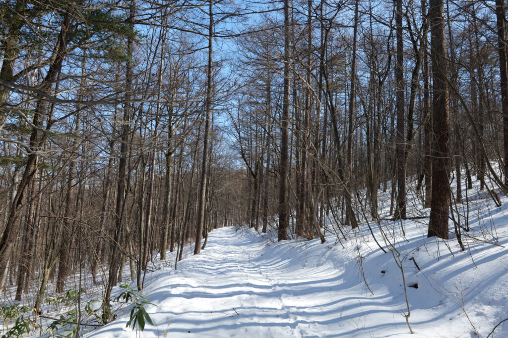 木々の間から差し込む冬の日差しが雪面に影を描き、とても美しい光景でした。