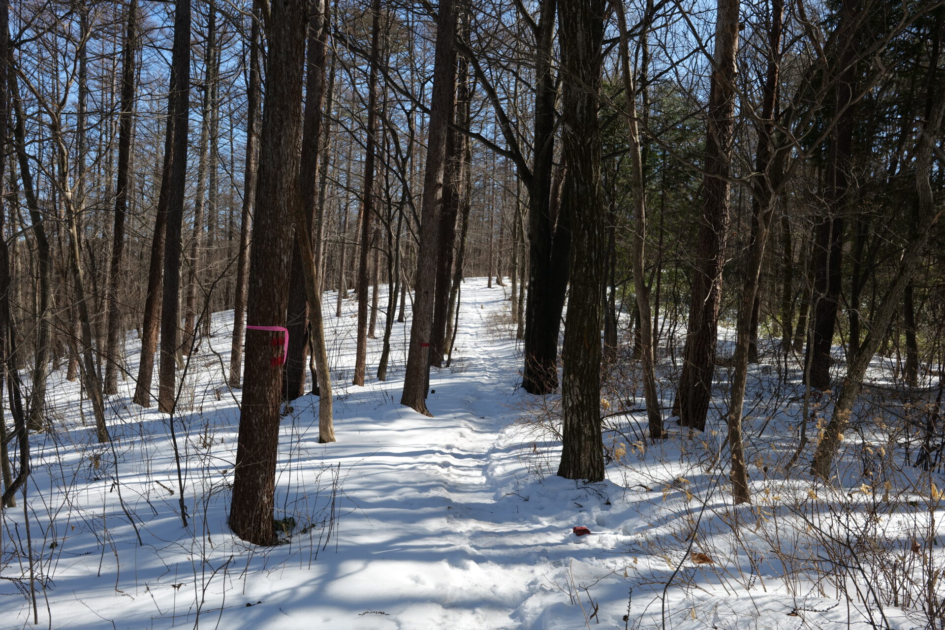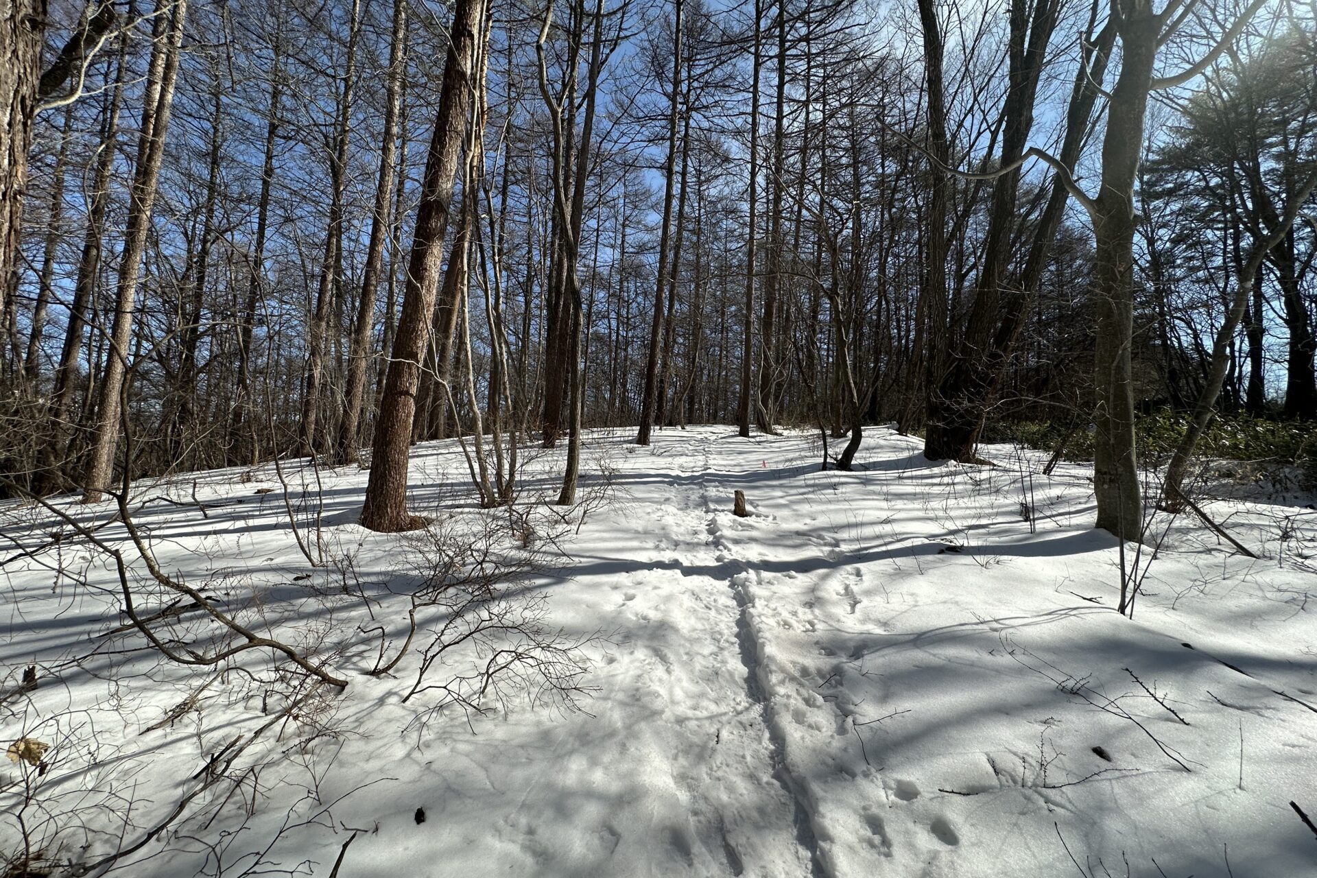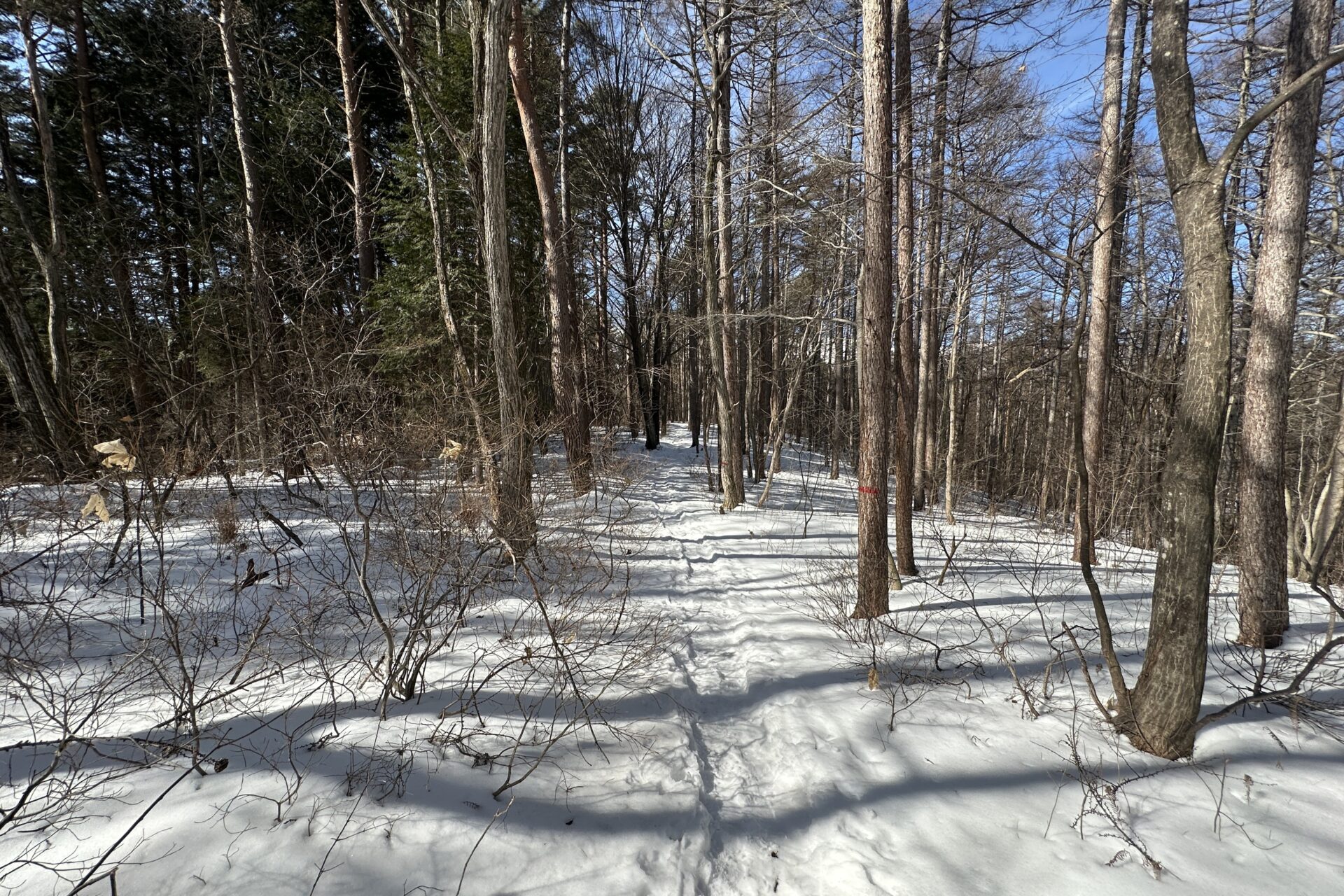 木々の間から差し込む冬の日差しが雪面に影を描き、とても美しい光景でした。