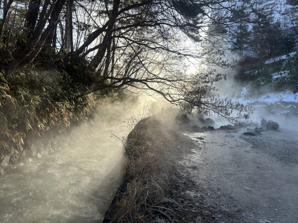 川の流れの上を漂う湯気はゆらゆらと揺れ動き、刻々とその表情を変えていきます。