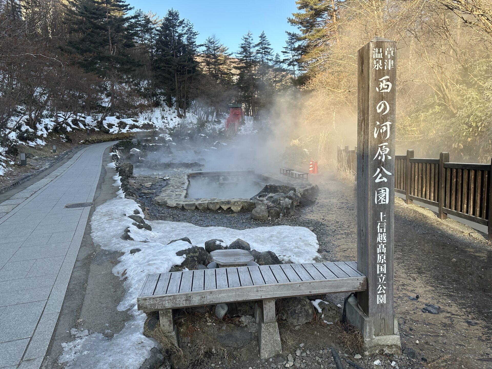 雪の残る地面と湯の温もりの対比も、冬ならではの美しさです。