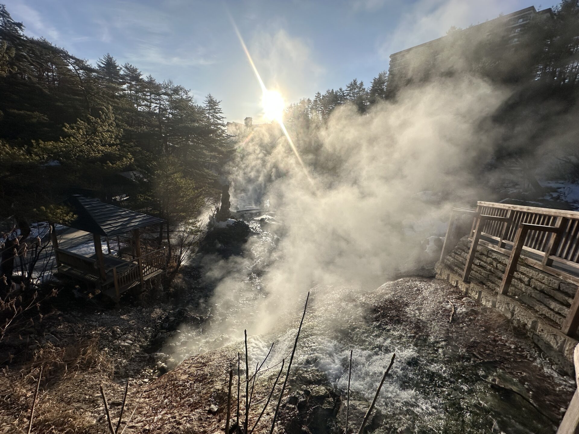 低い位置から差し込む太陽の光が、湯けむりに反射し、黄金色に輝いております。