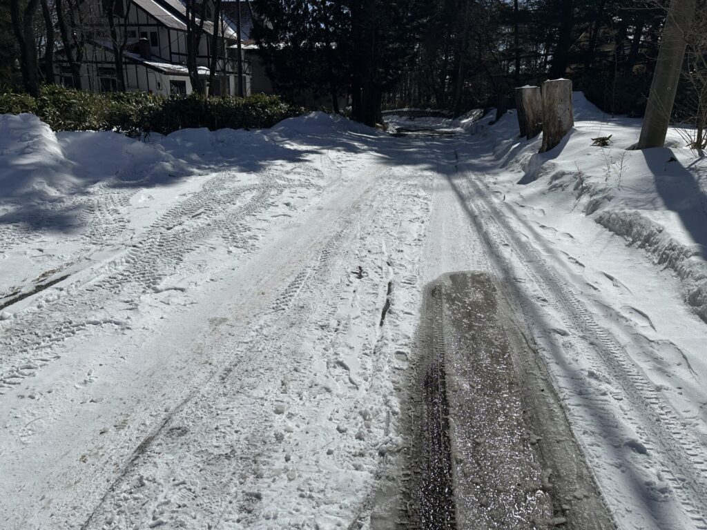 実際に撮影した道路では、タイヤの跡が凍り付き、部分的に氷が張っている状態でした。