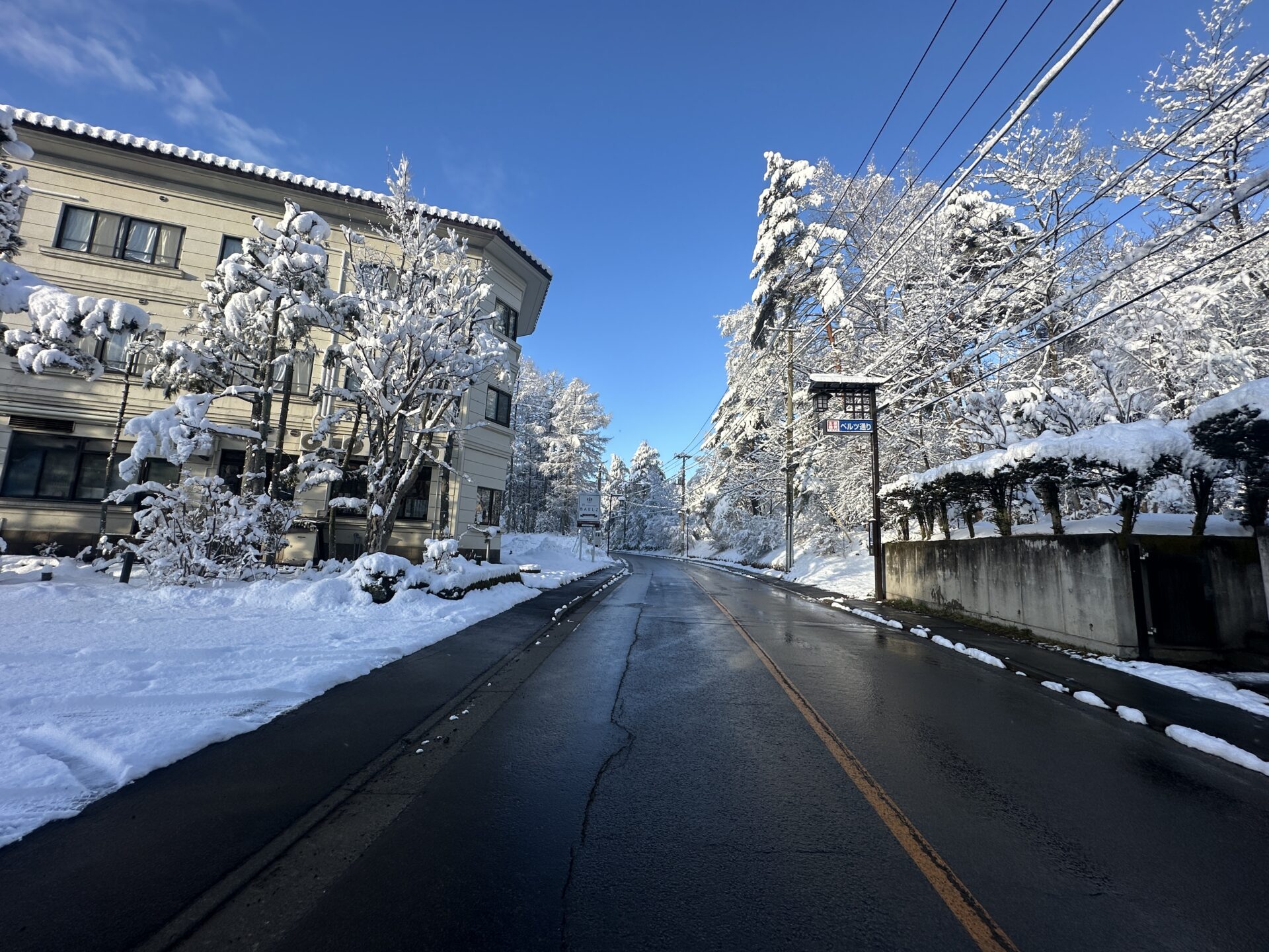 道路は融雪により徐々に走行しやすい状態となっておりますが、朝晩は滑りやすくなりますのでどうぞお気をつけくださいませ。
