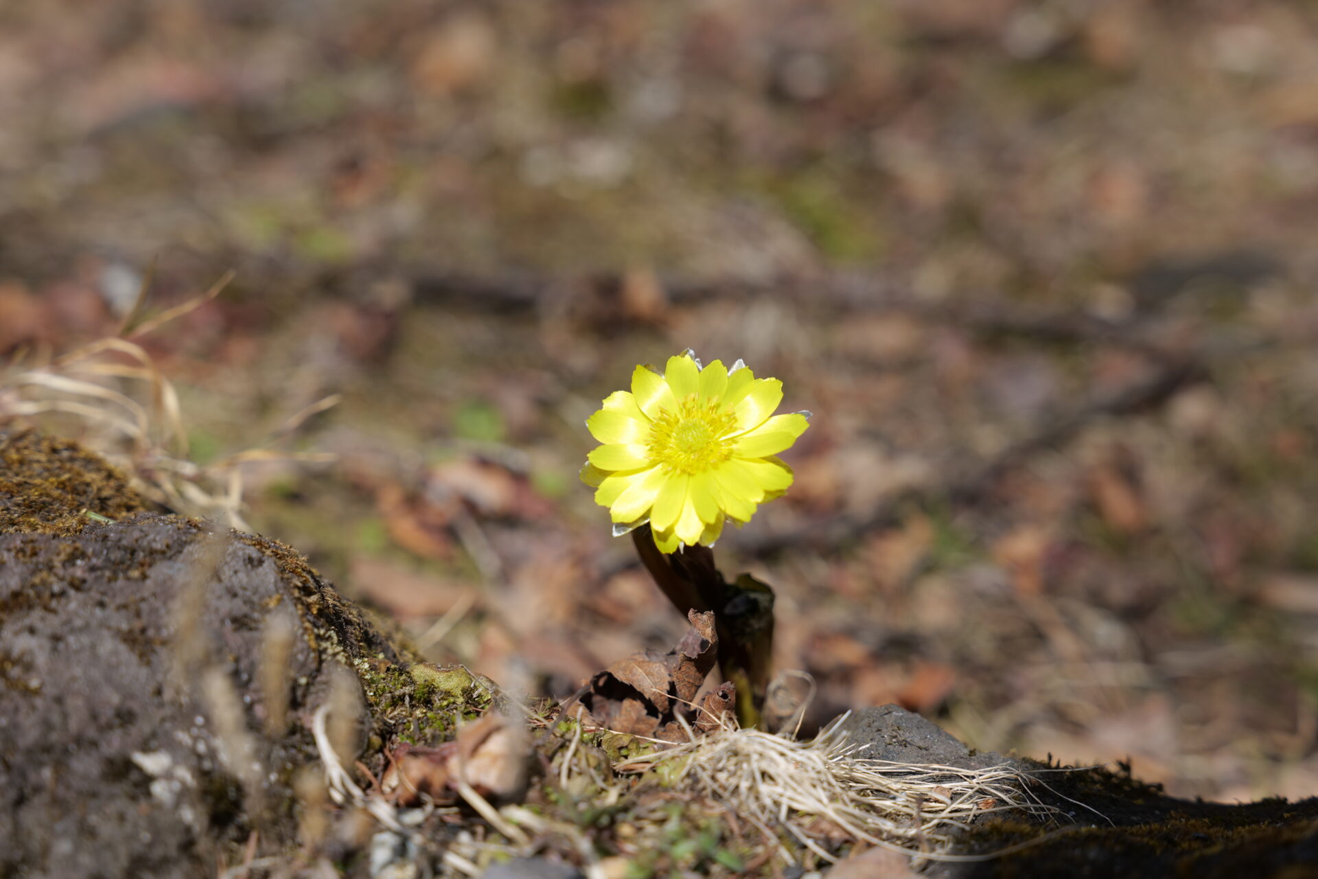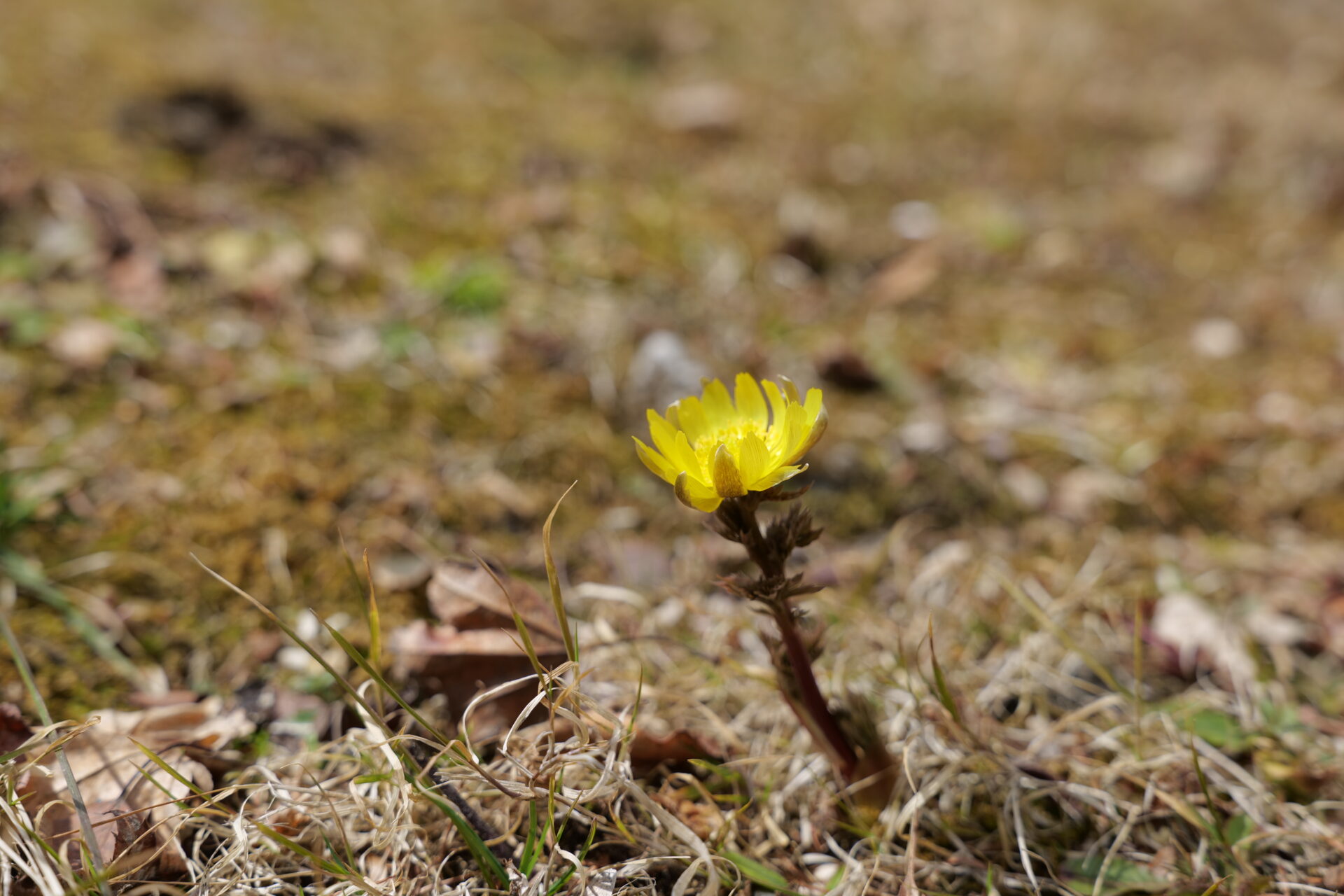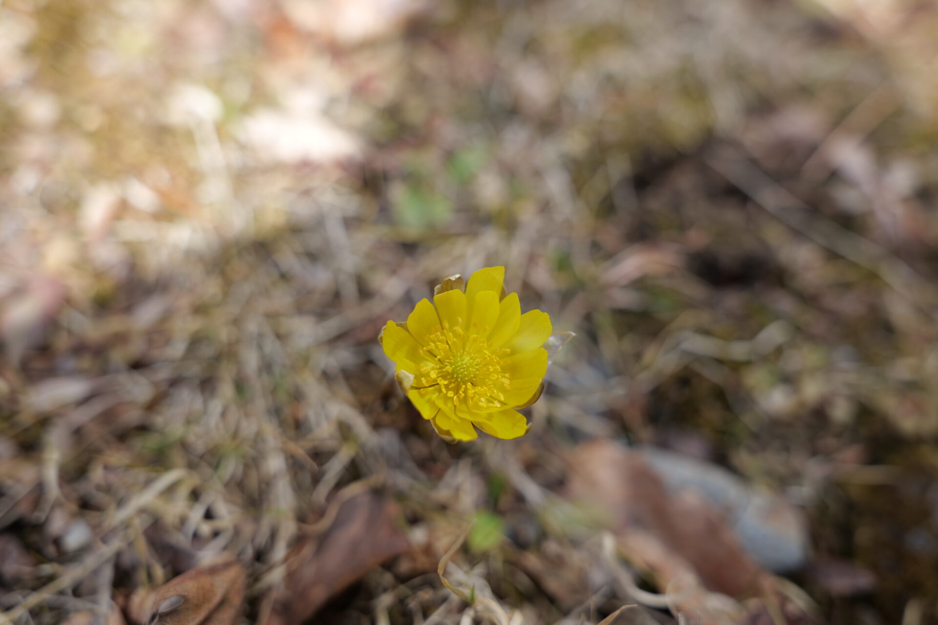 今回見つけた福寿草も、枯れ草の間からそっと顔を出し、
