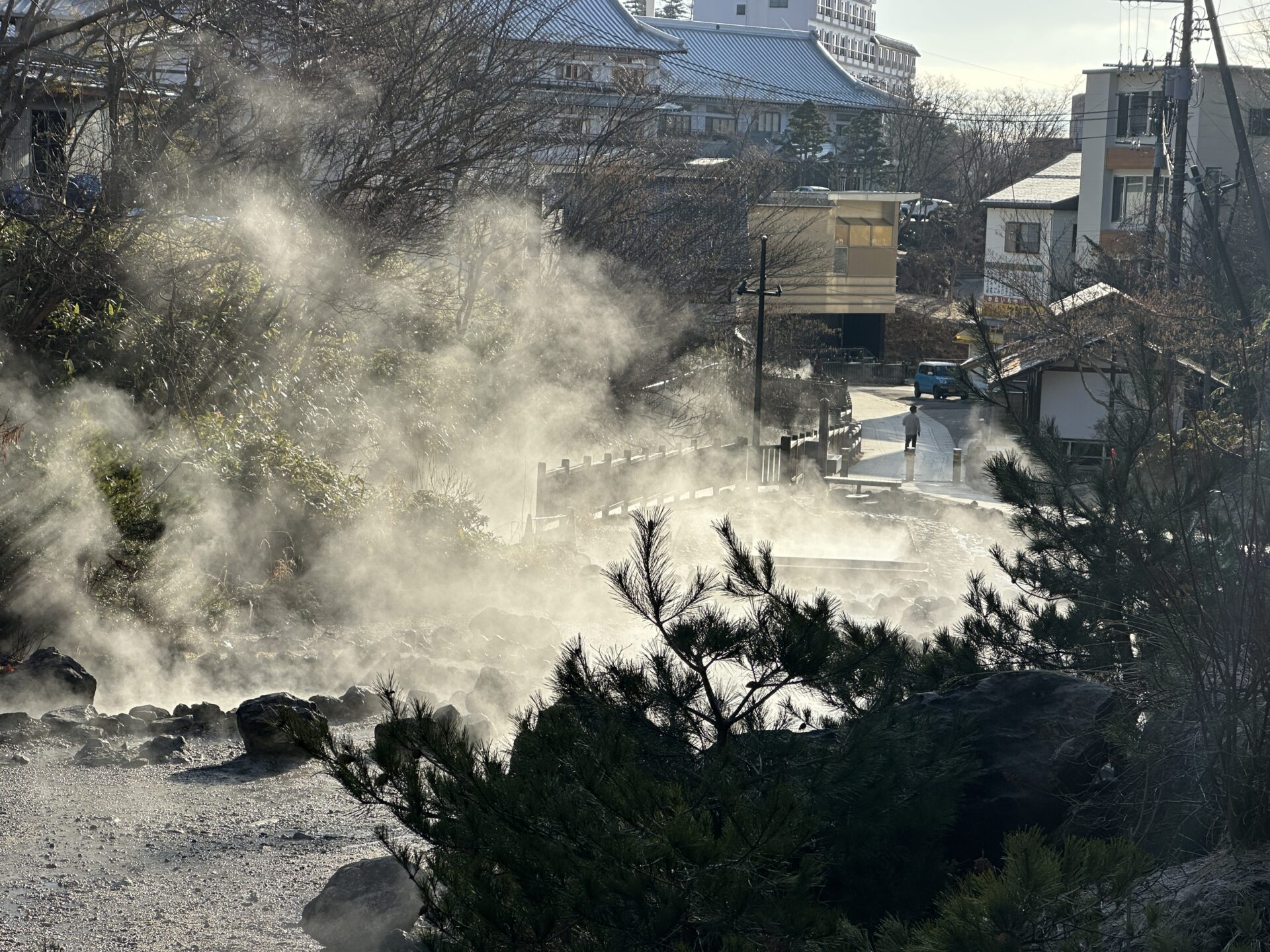 湯けむりの向こうに見える遊歩道や足湯も、どこか神秘的で、