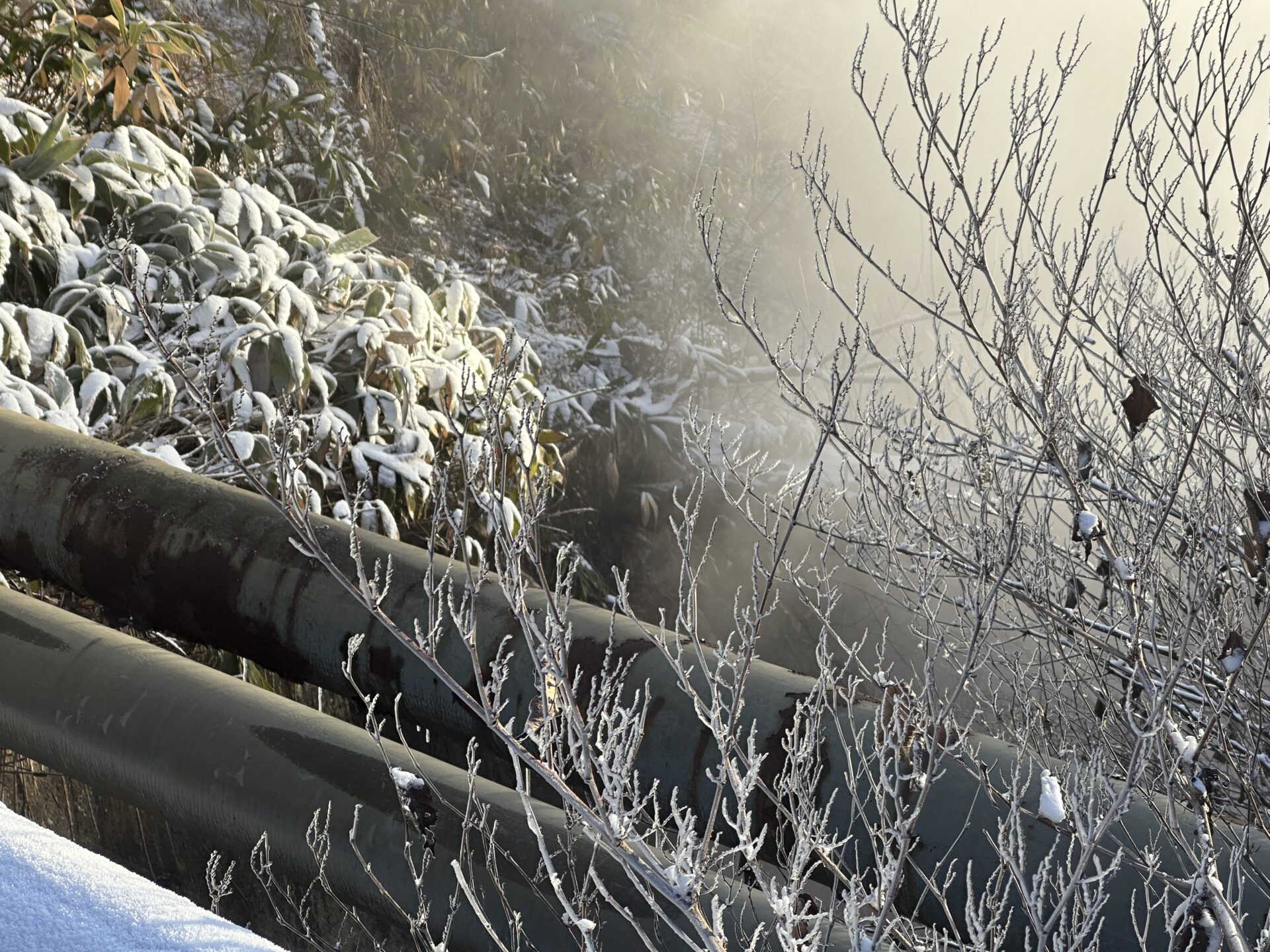 川から立ち上る湯気が周囲の木々に触れて凍りつく