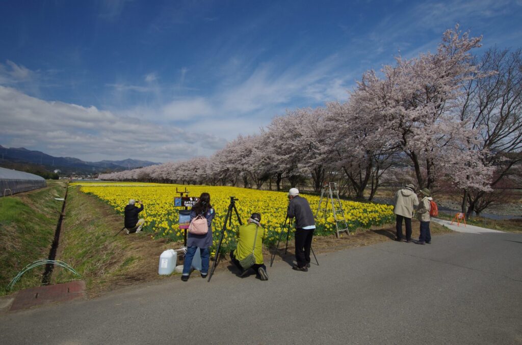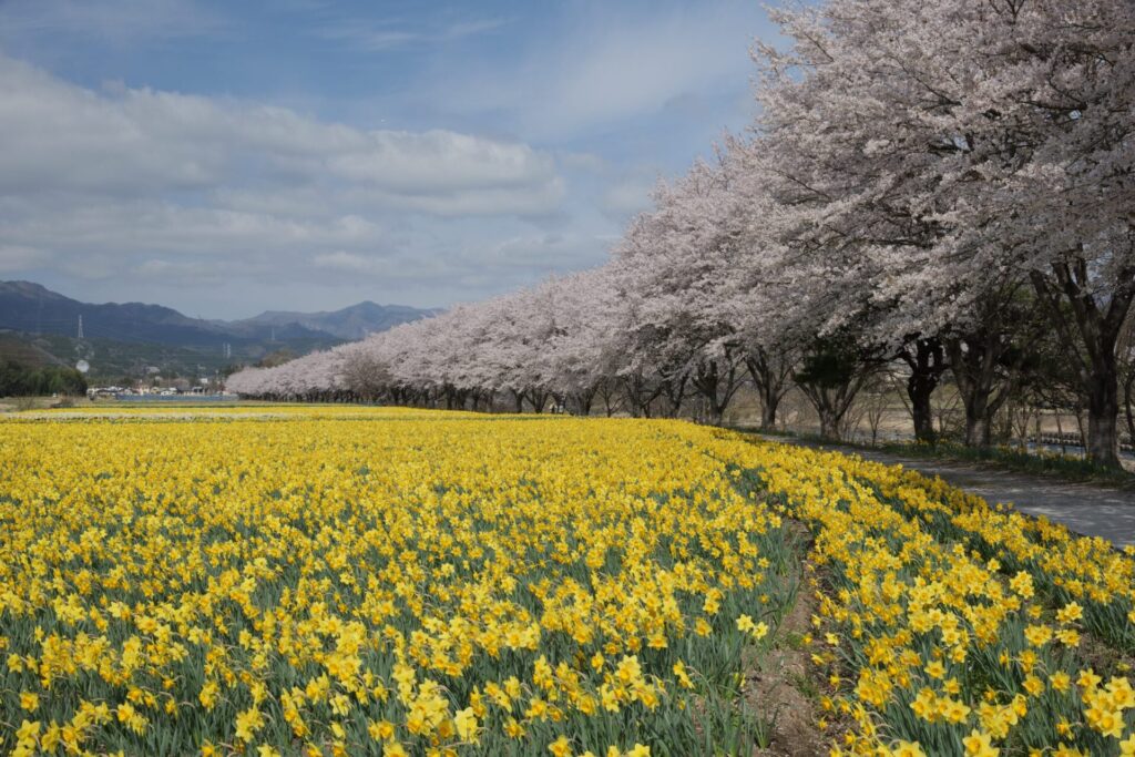 会場では、水仙畑の向こうに長く続く桜並木が広がり、