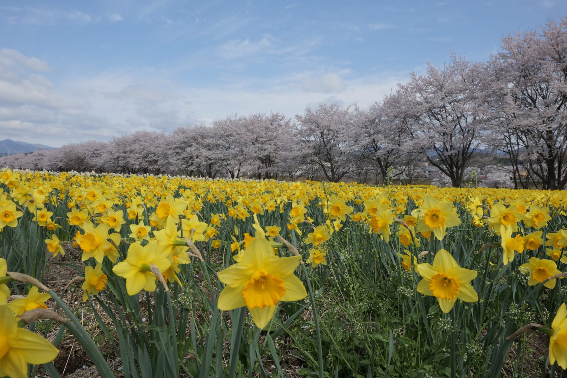 春の訪れを感じられる、美しい水仙と桜の景色。