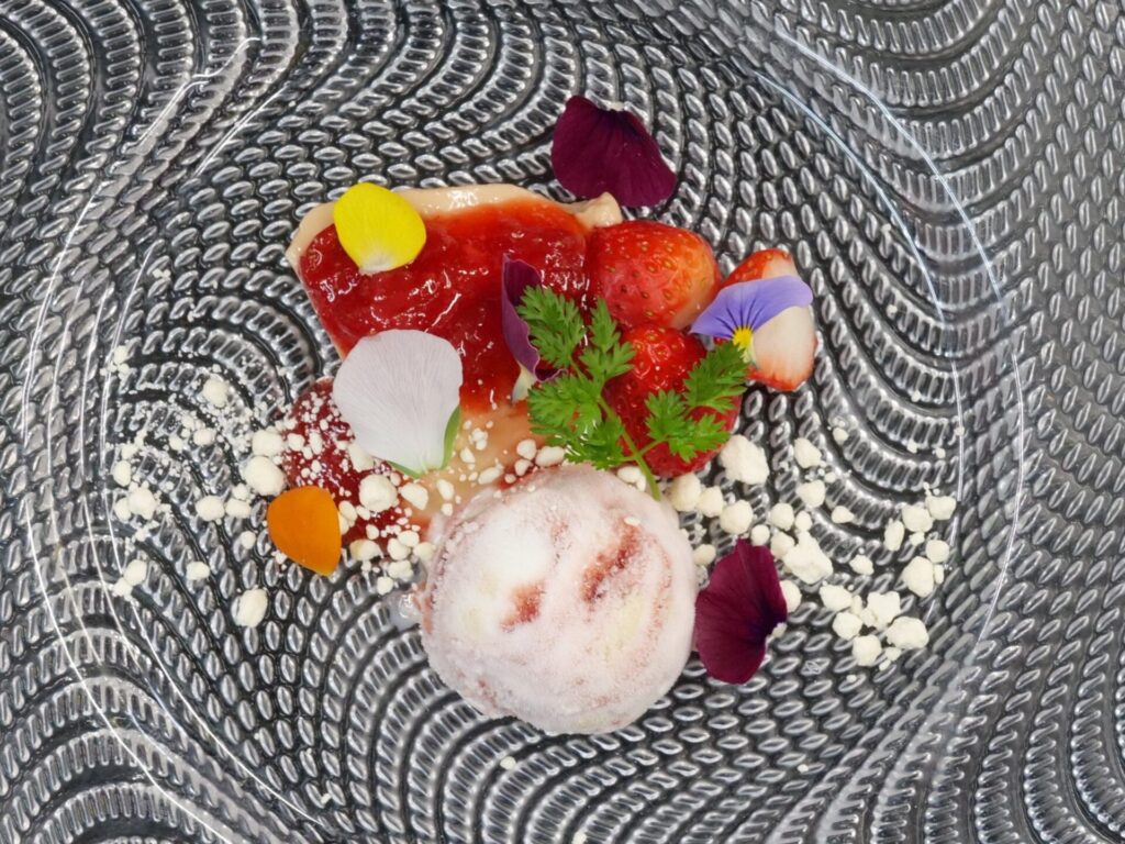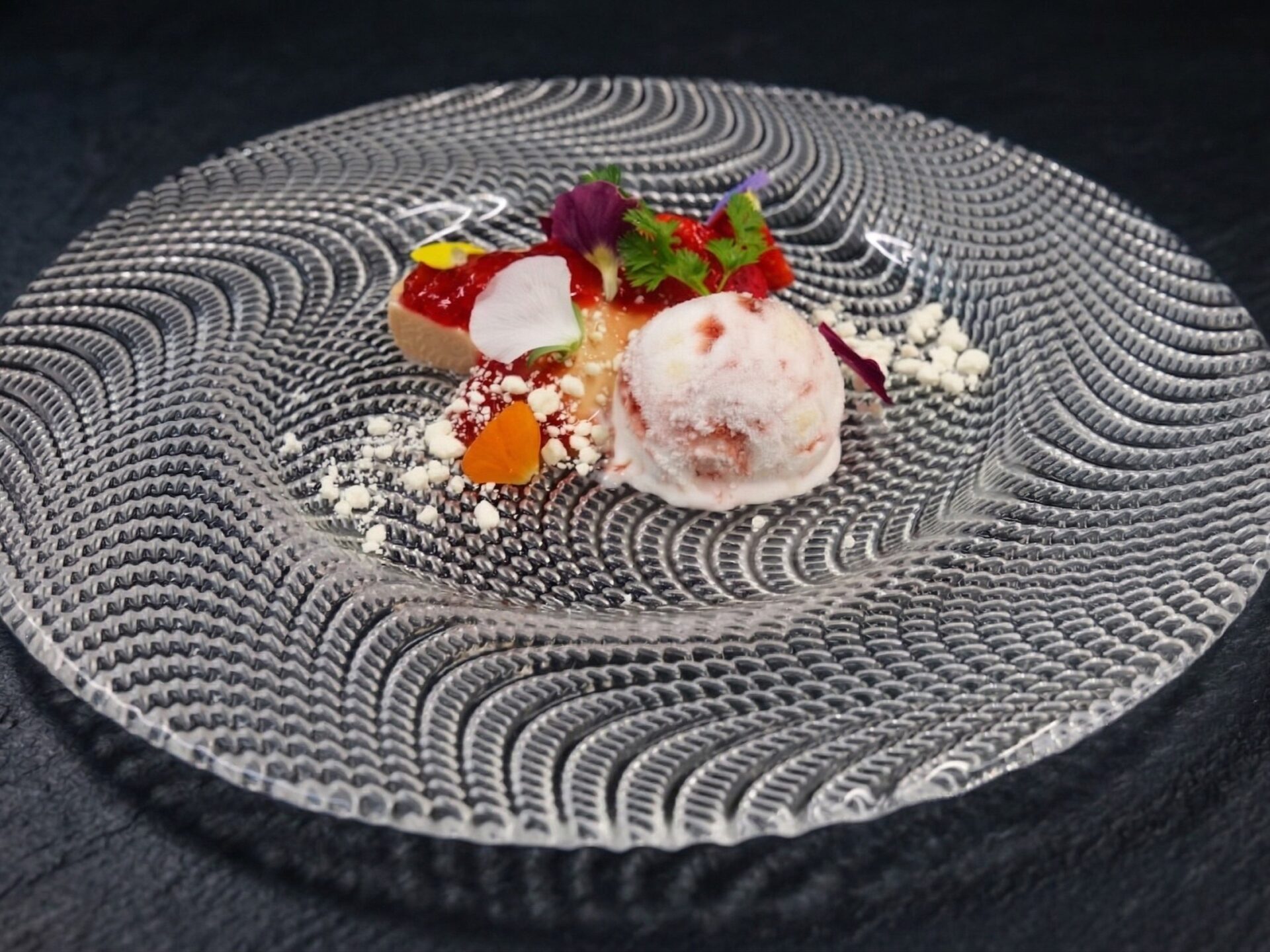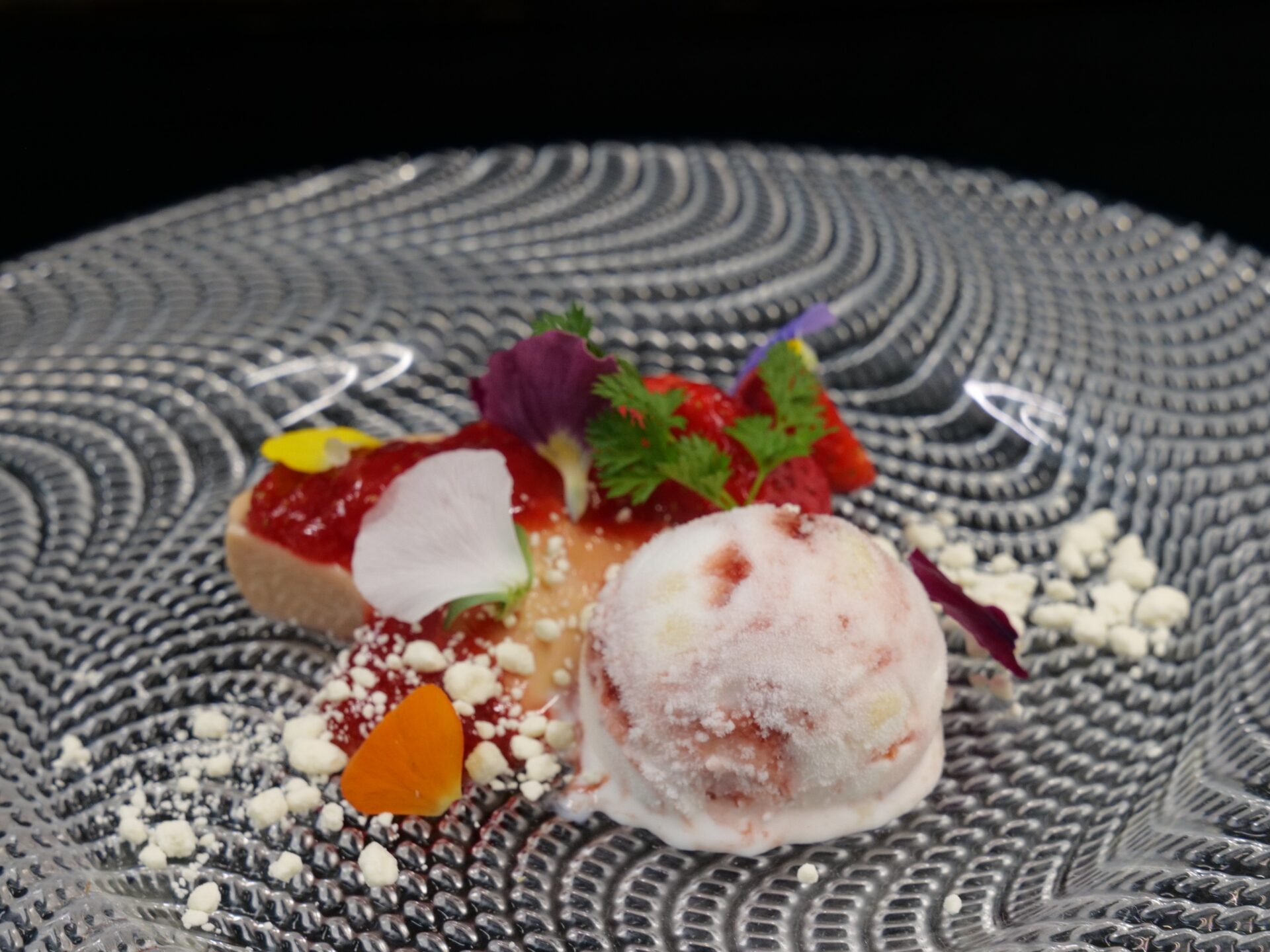 このデザートには、苺のさまざまな味わいが丁寧に詰め込まれています。