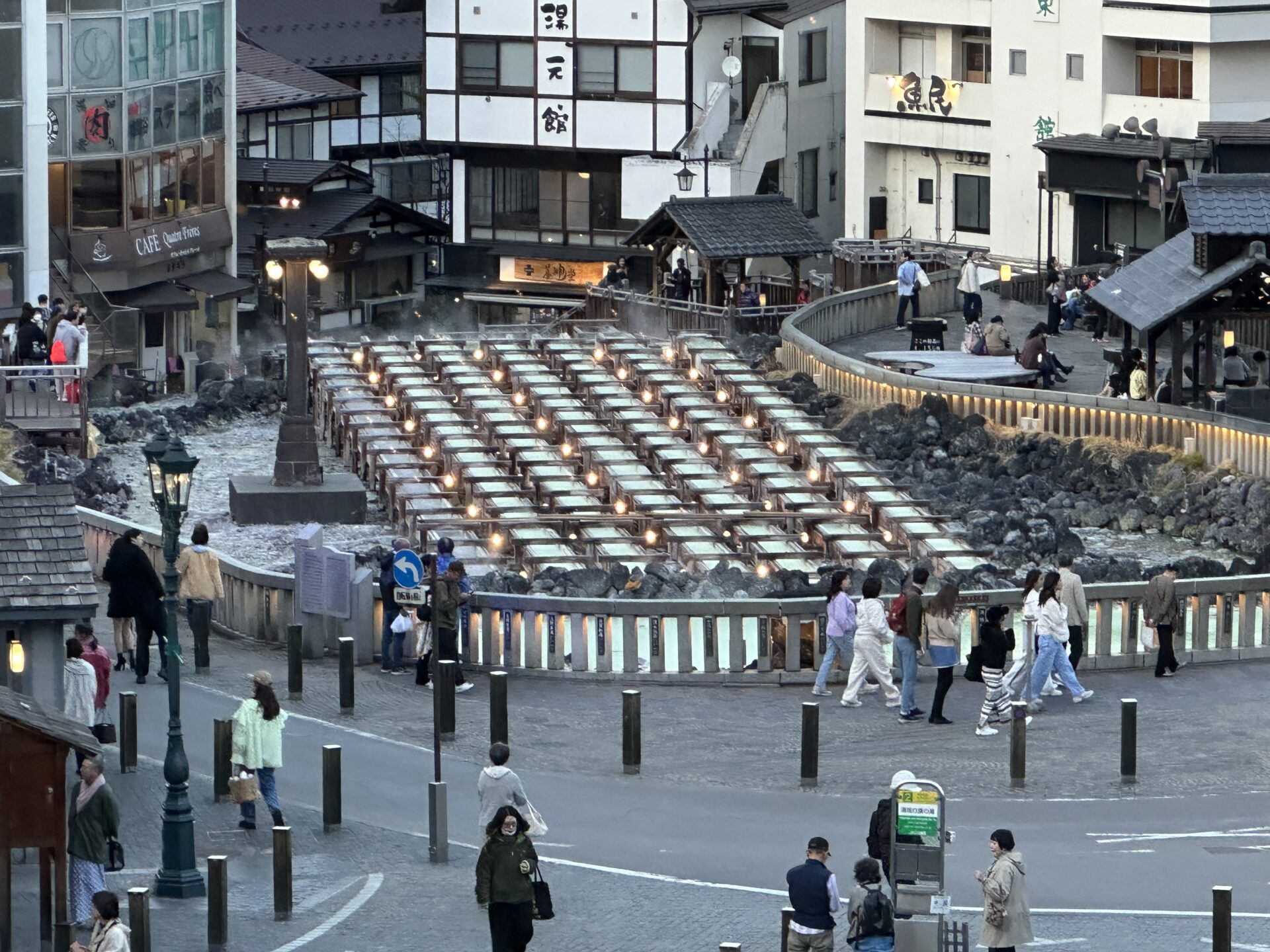 湯畑では、絶え間なく湧き出る温泉から湯けむりが立ち上り、