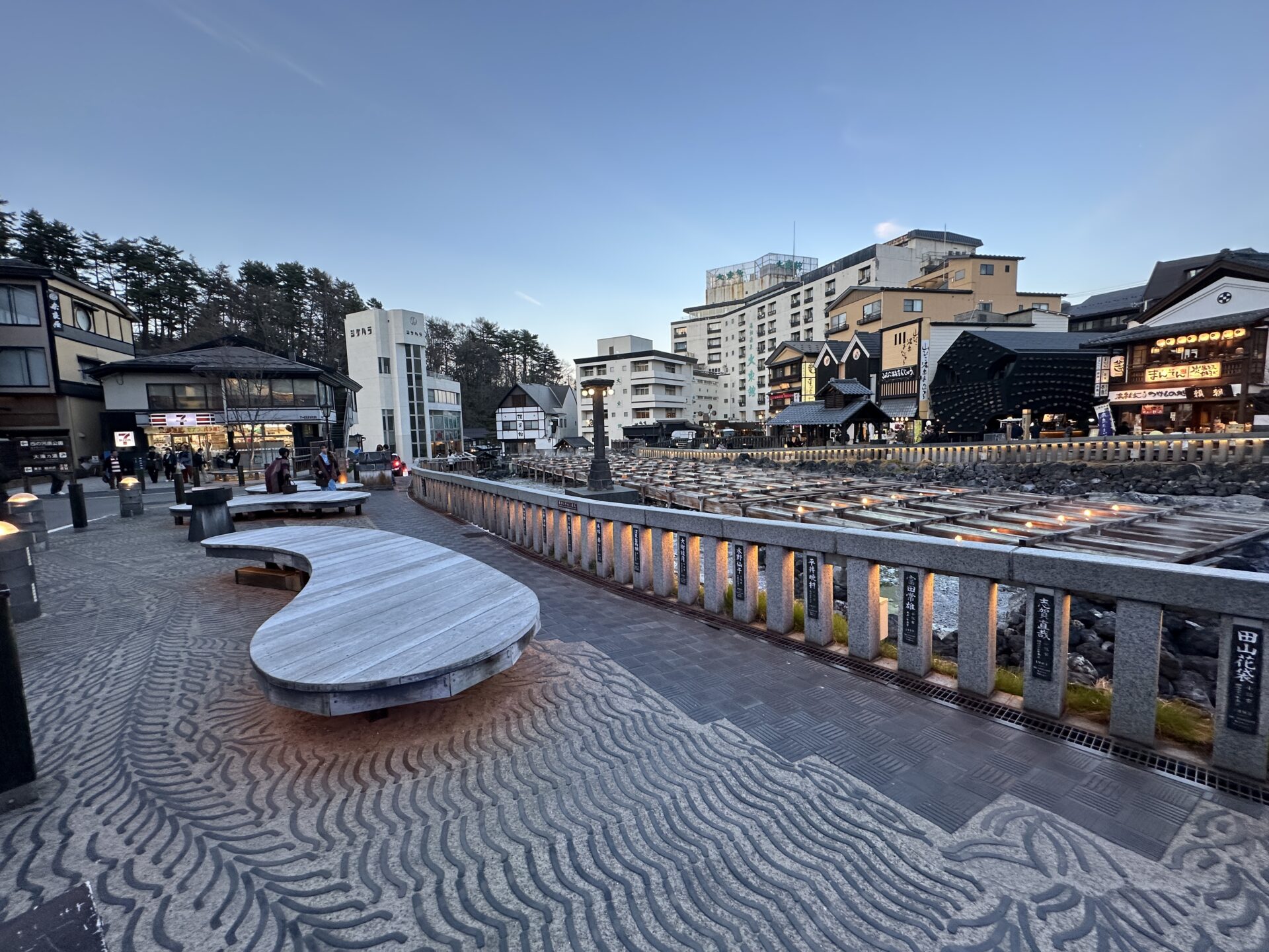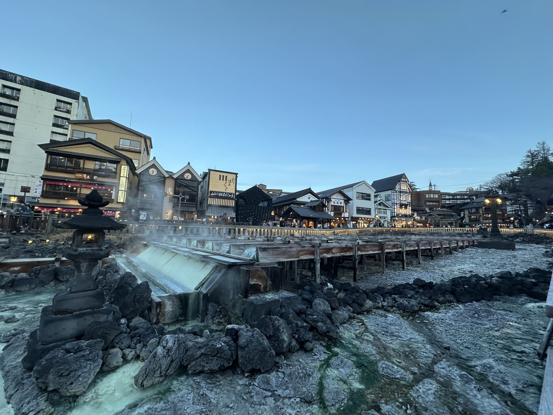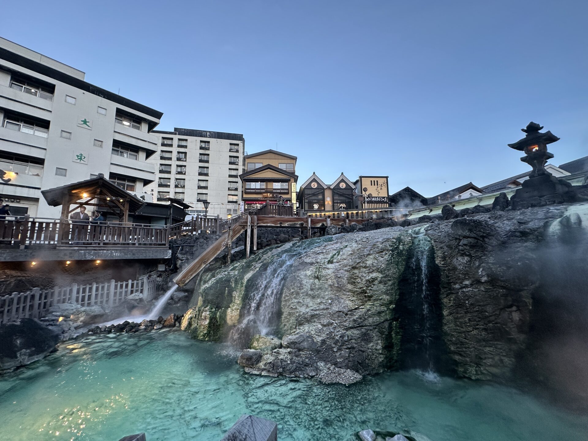 ✨ 薄暮の時間に輝く、幻想的な湯畑