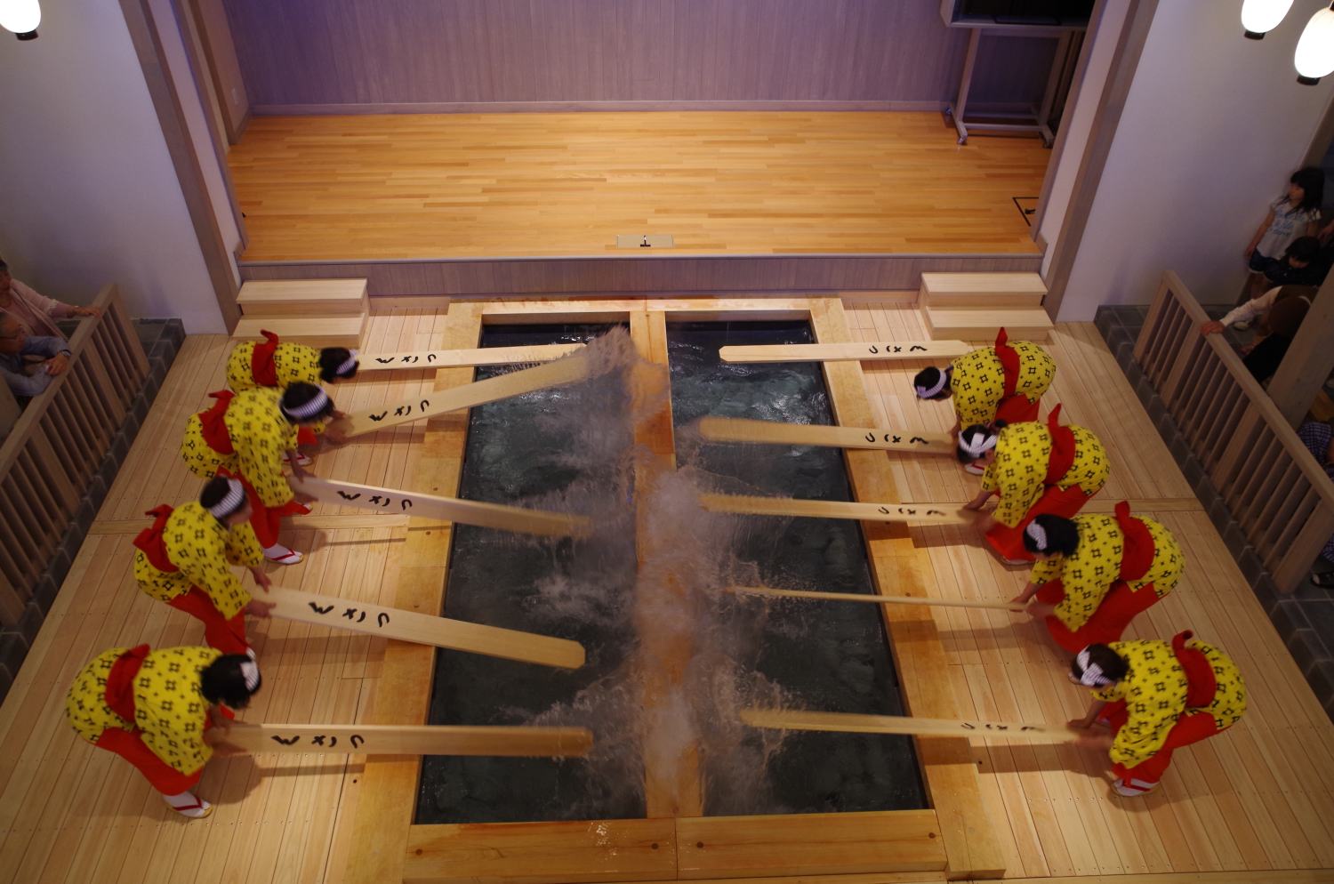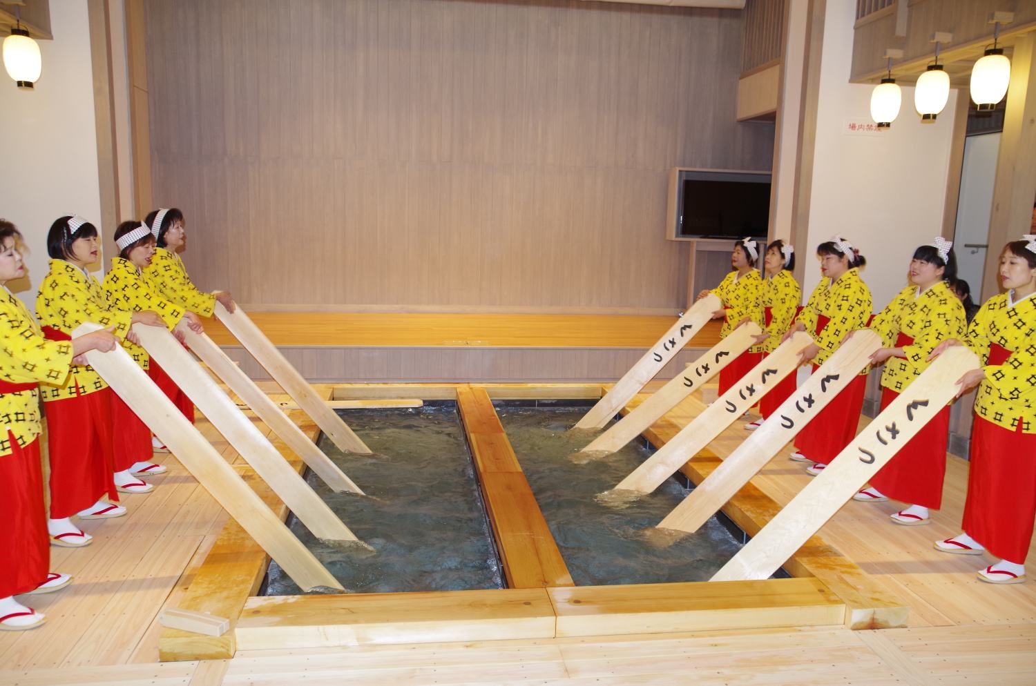 湯もみ娘たちが息を合わせて湯をもむ様子を見ることができます。
