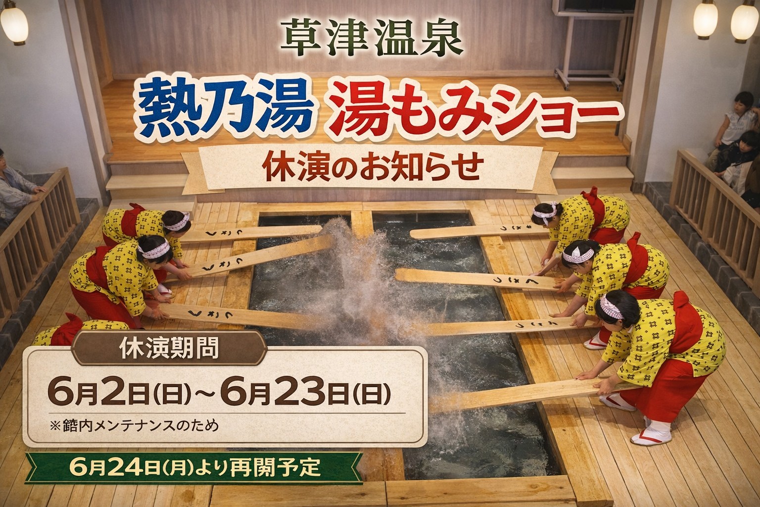 熱乃湯「湯もみと踊り」ショー休演のお知らせ(2026年6月2日~6月23日)