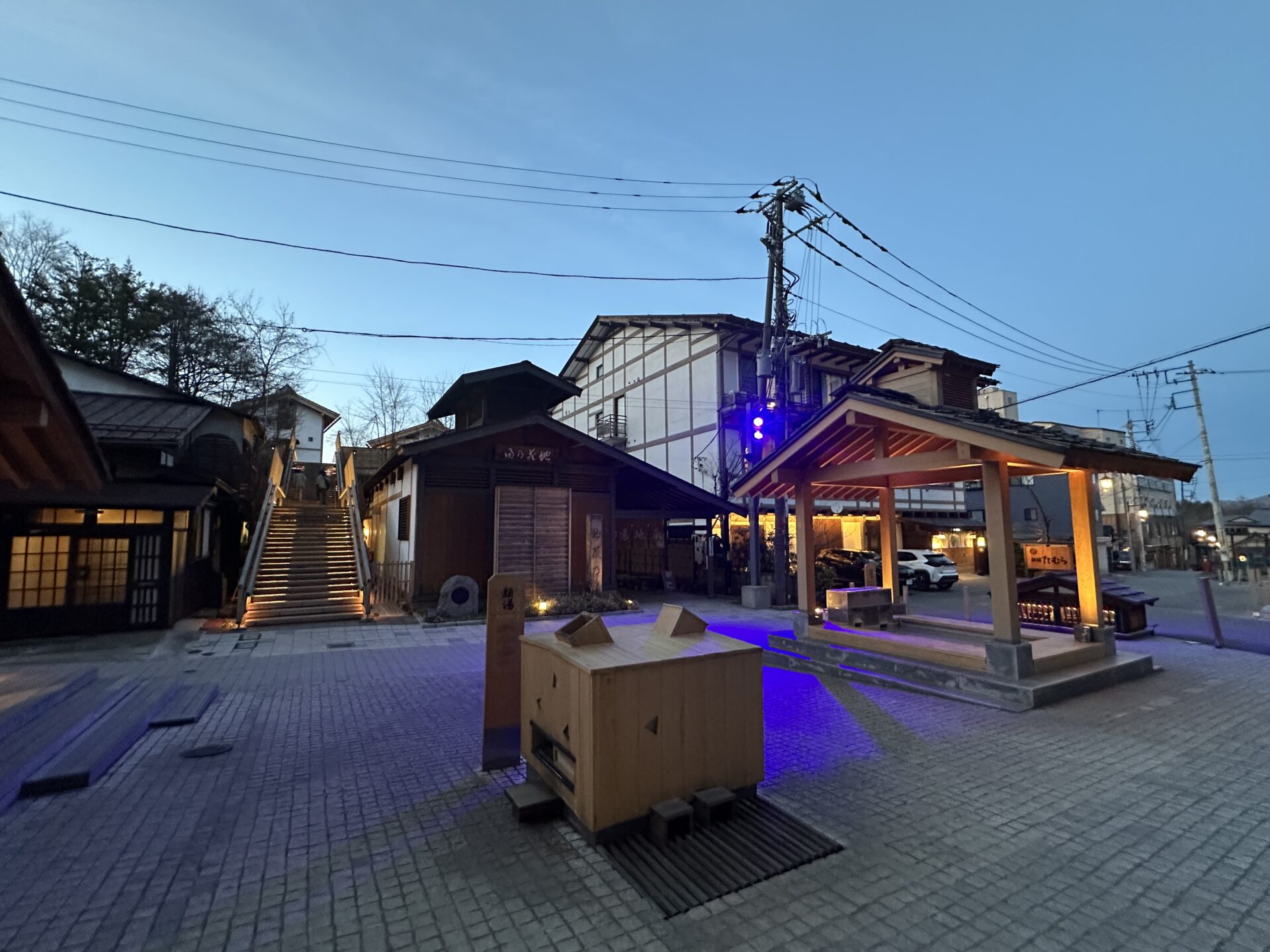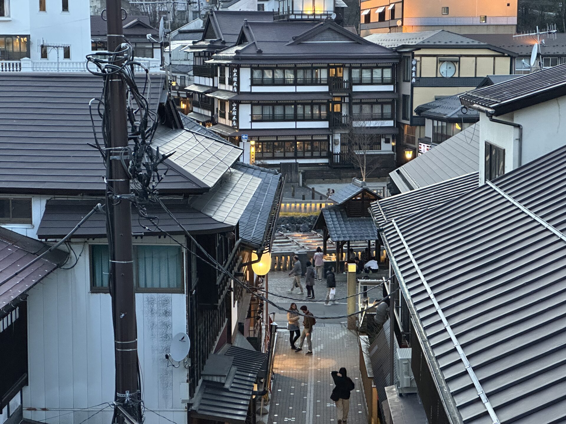 夕暮れの温泉街は、昼間とは違う落ち着いた雰囲気に包まれ、とても風情があります。